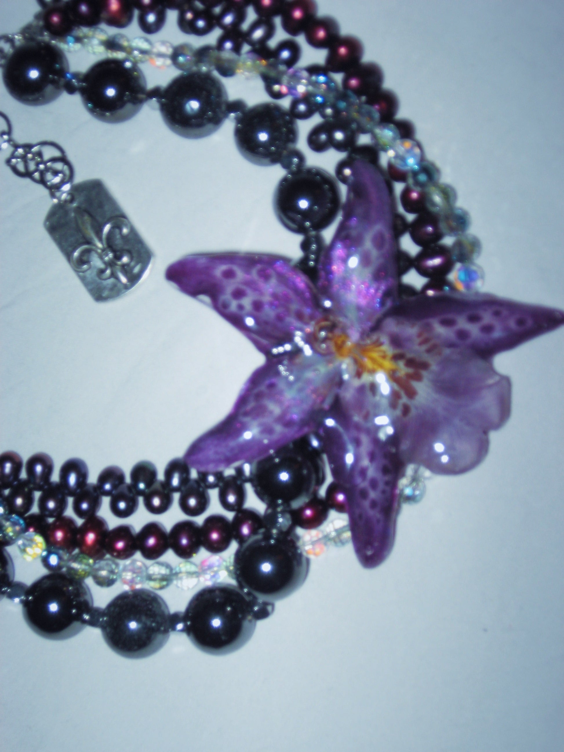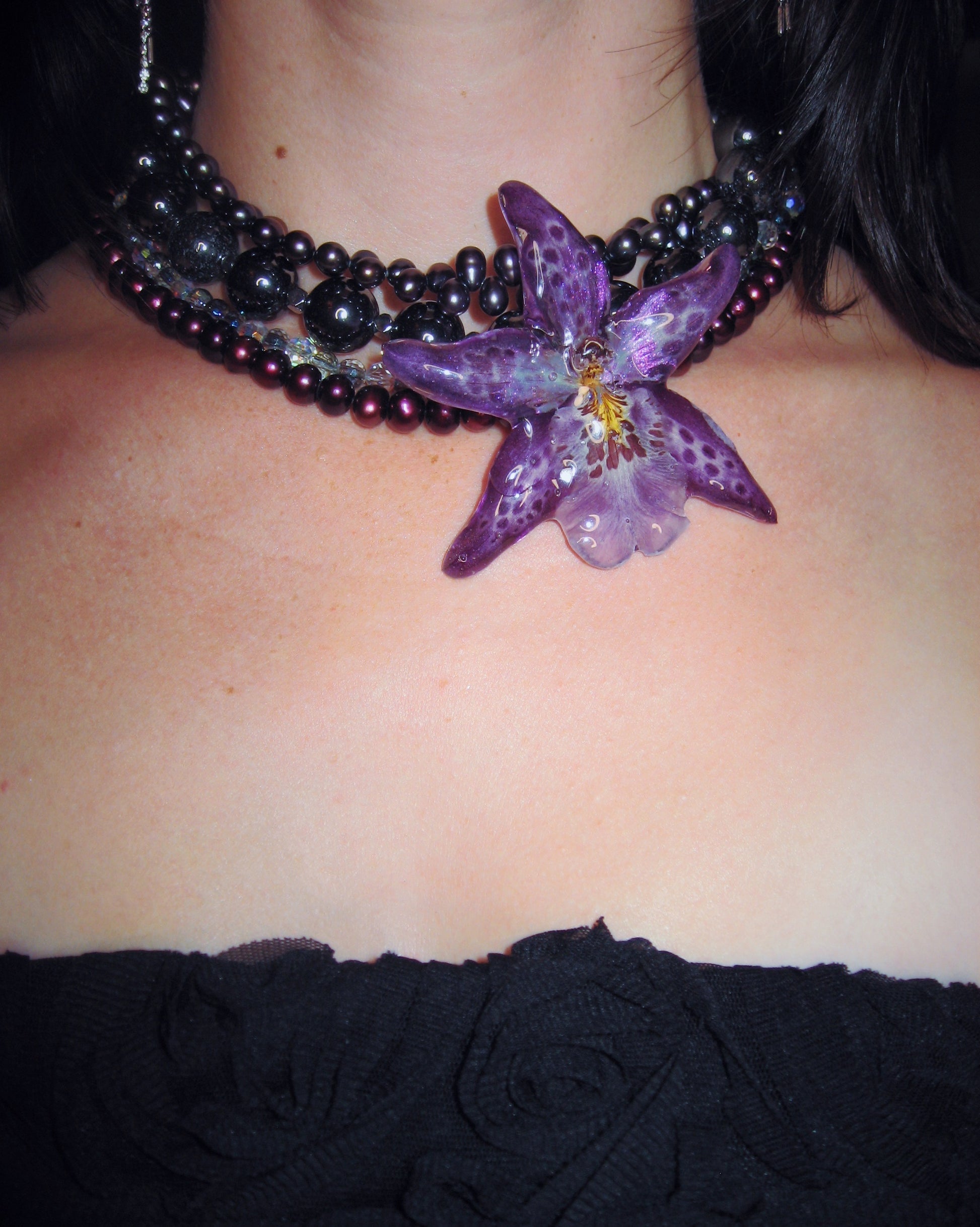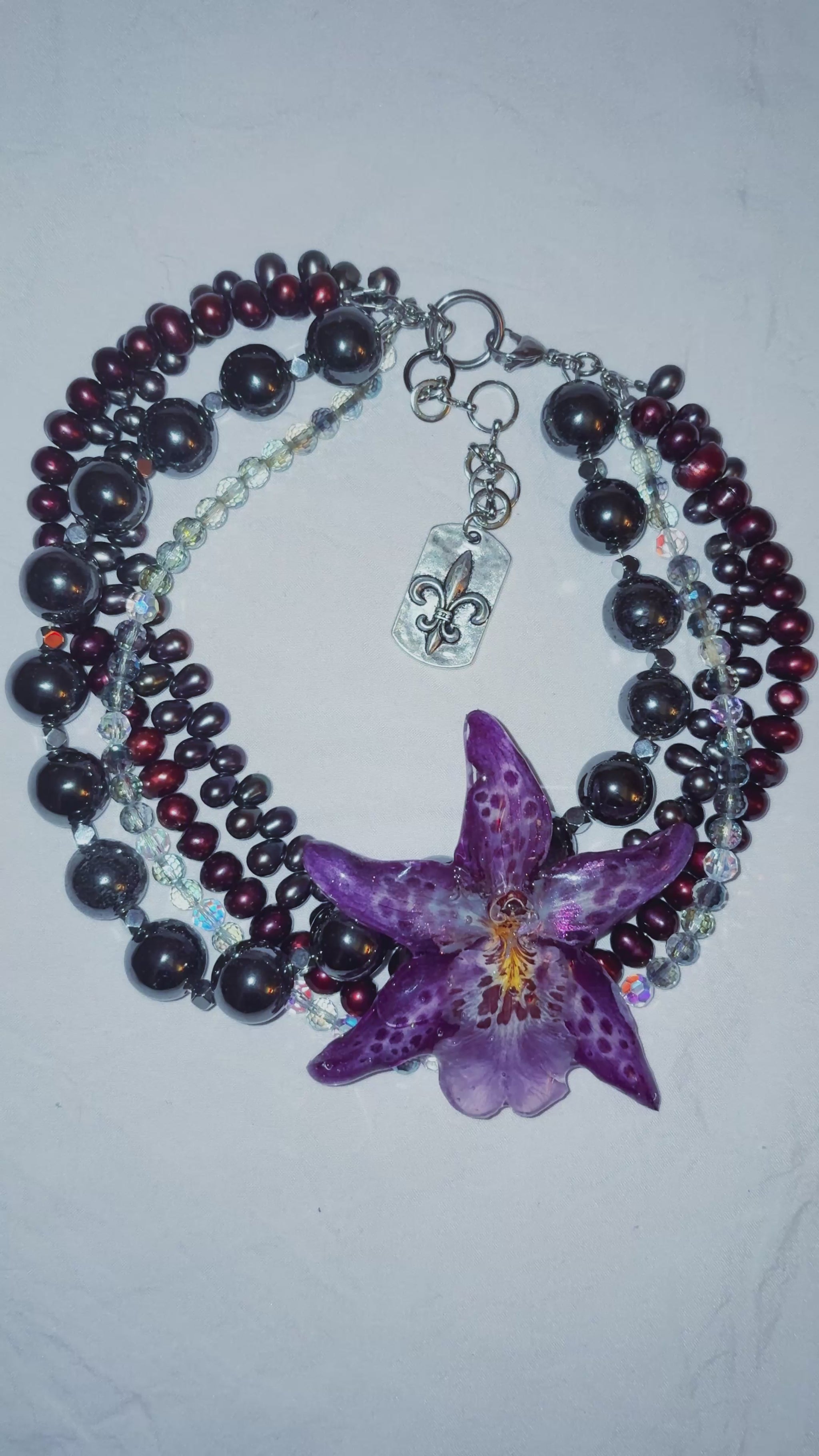 real orchid flower surrounded by glass, freshwater pearls and hematite.