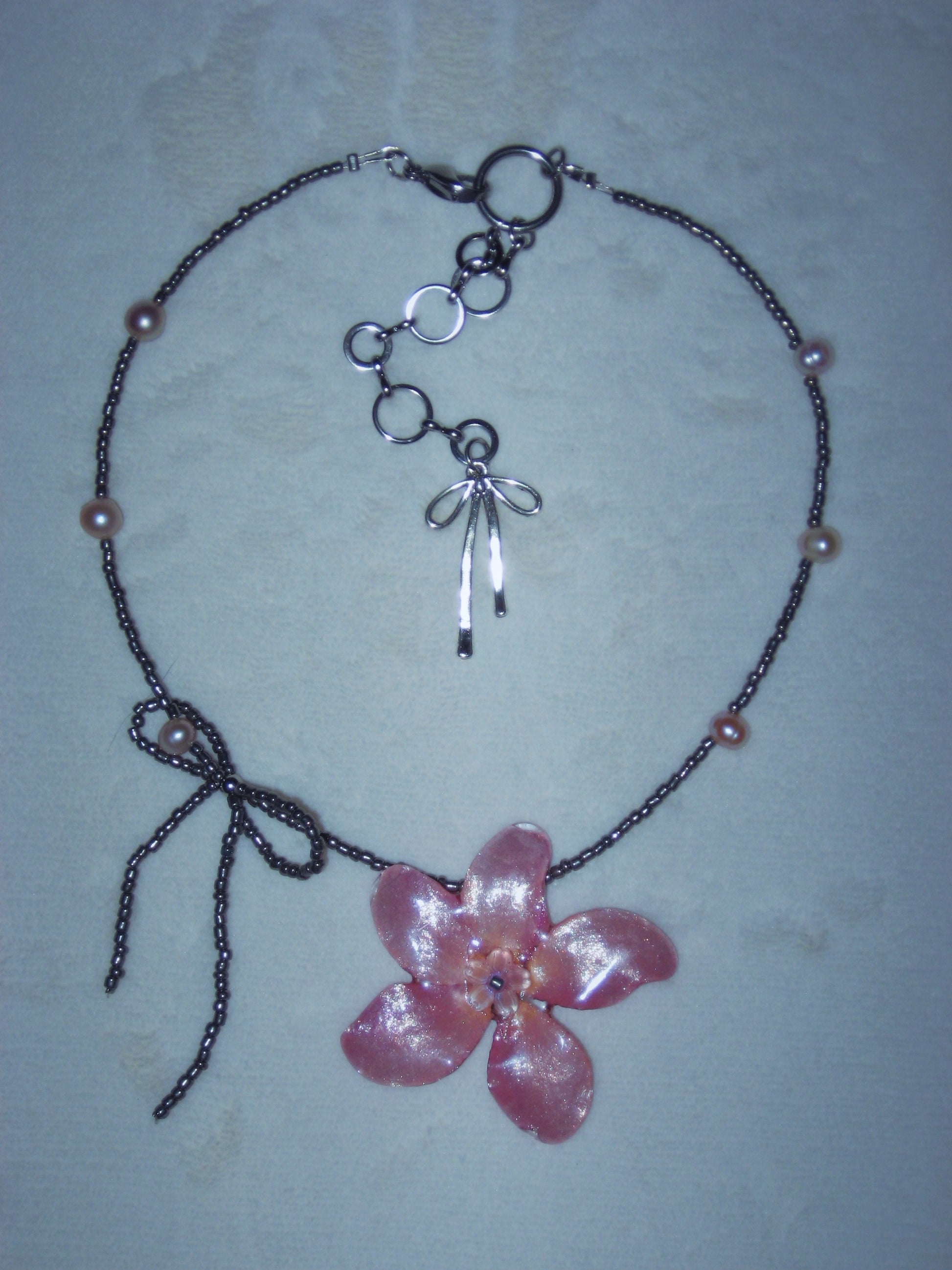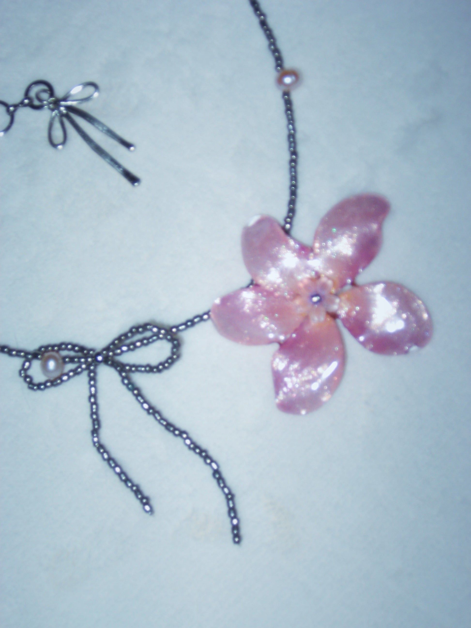 real plumeria flower surrounded by glass and freshwater pearls.
