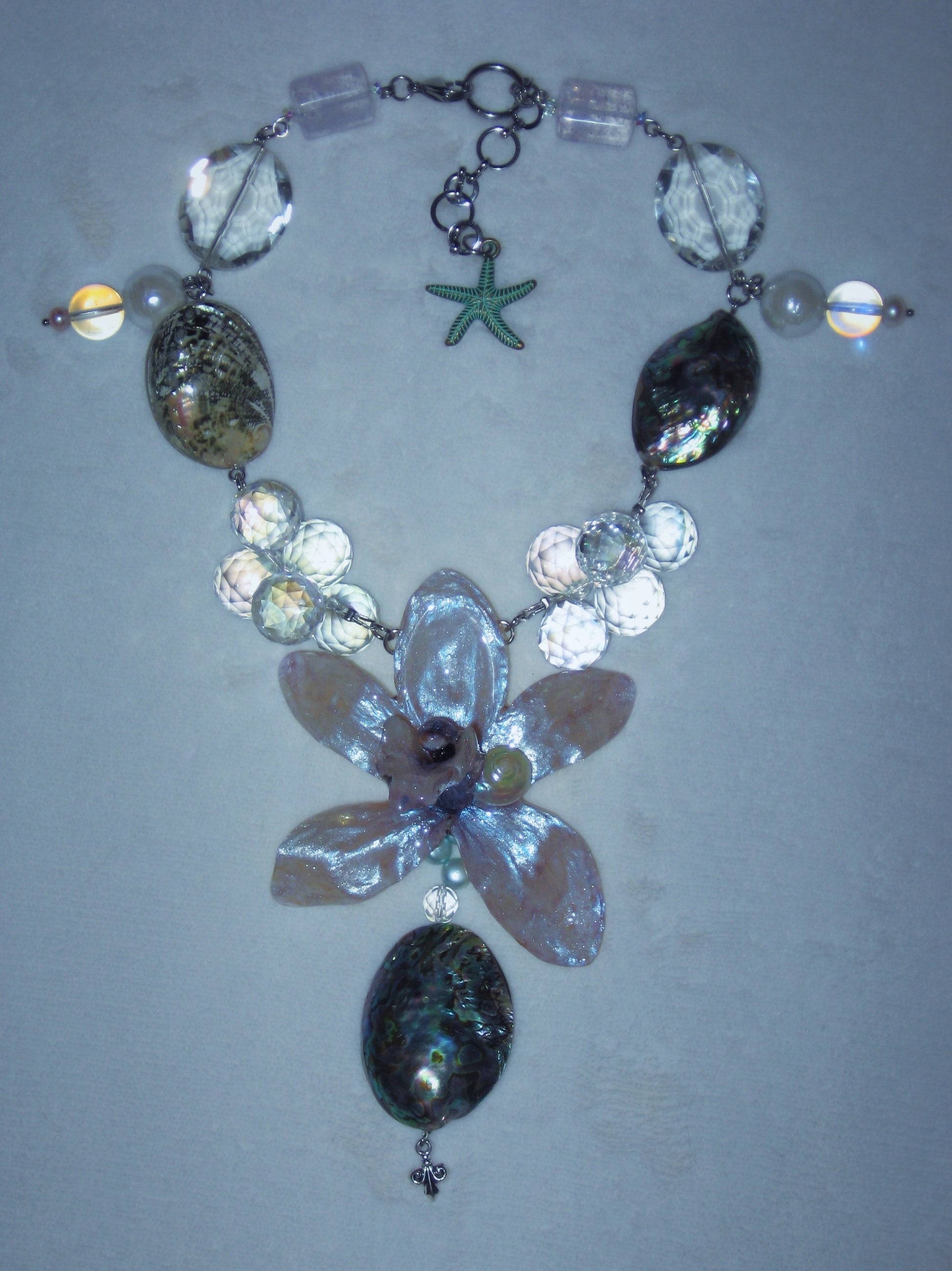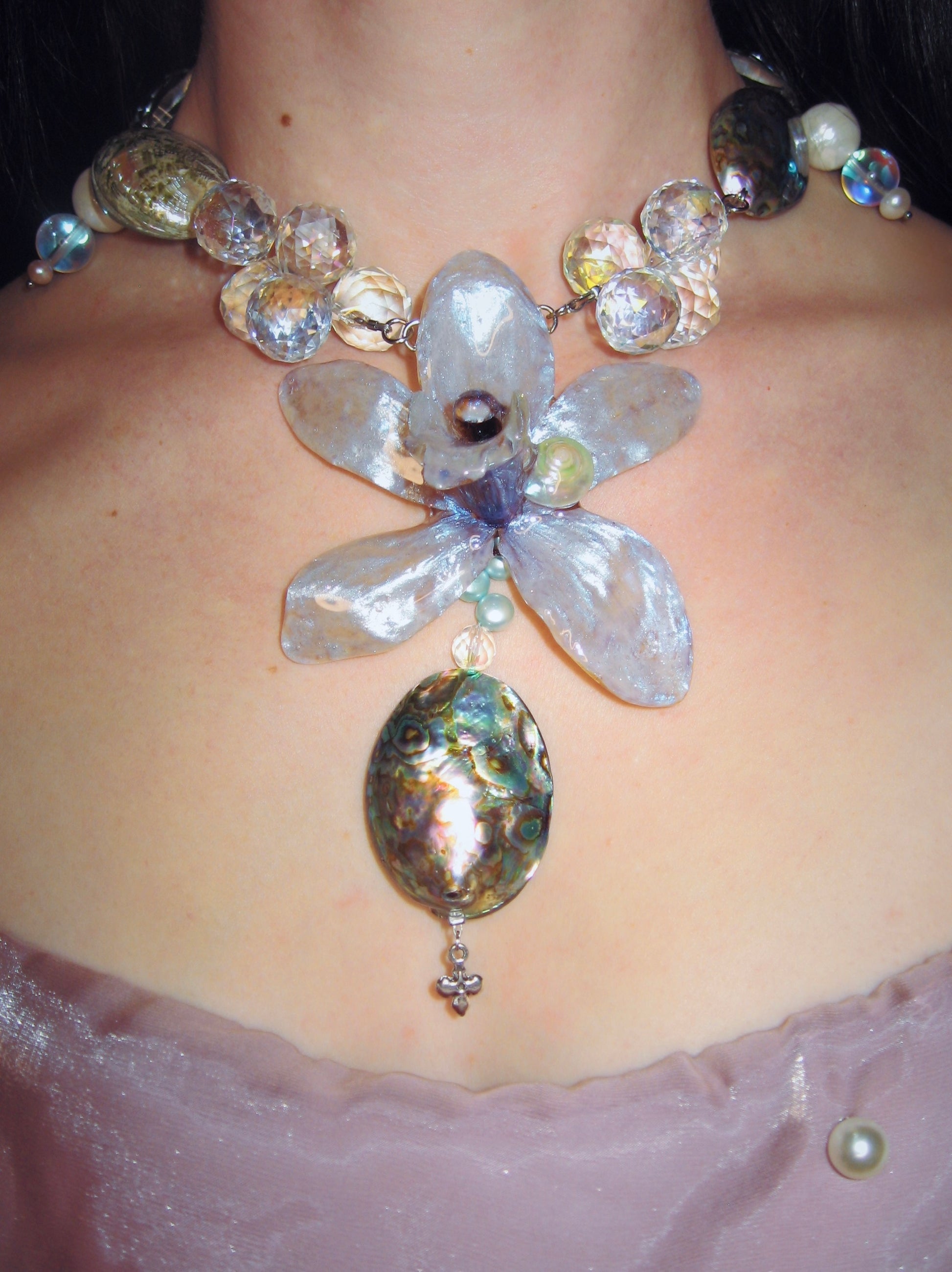 real orchid flower surrounded by glass, abalone, mother of pearl, shell and freshwater pearls.