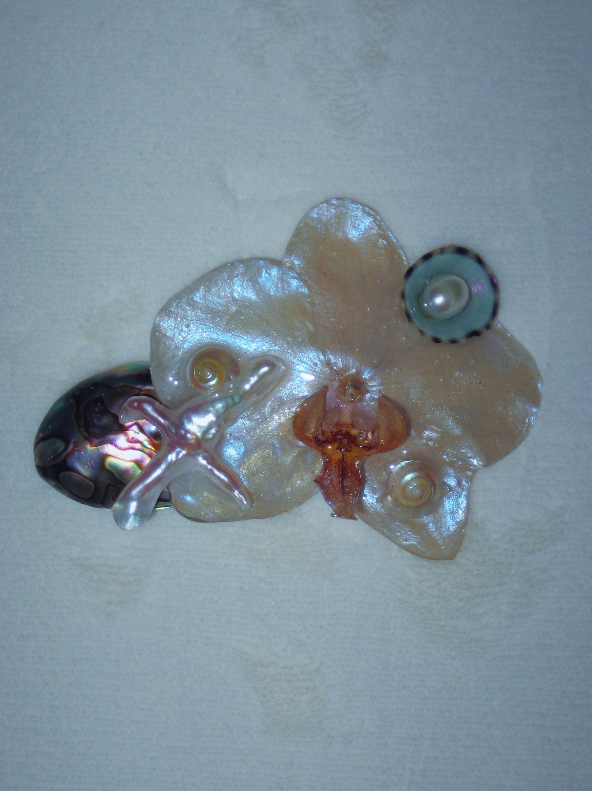 real orchid flower hair clip surrounded by abalone, shell, limpet and freshwater pearls.