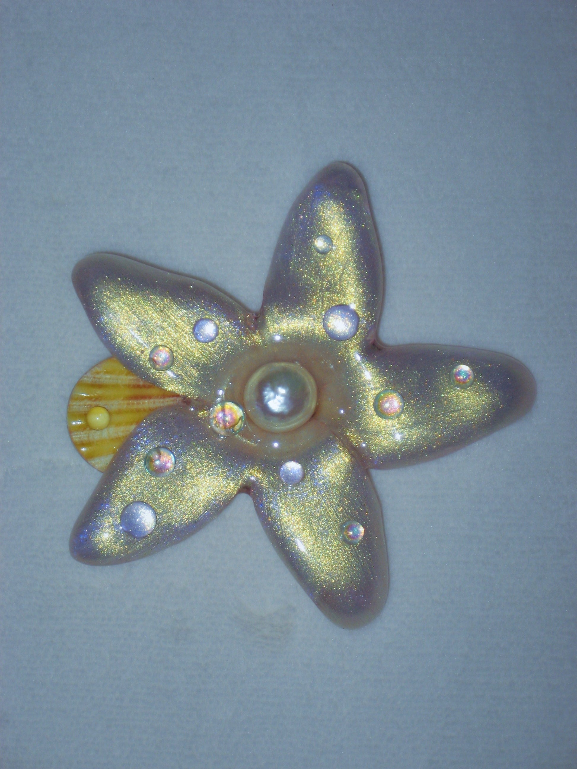 real plumeria flower hair clip surrounded by shell and freshwater pearls.