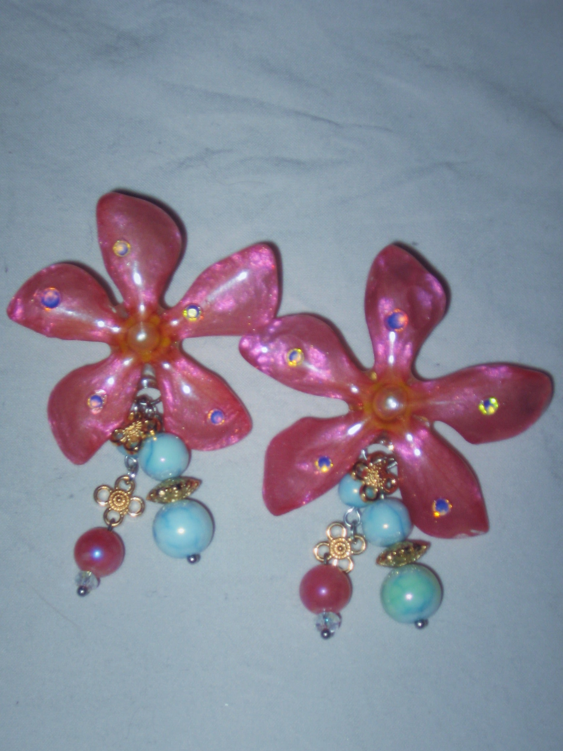 real mandevillea flower stud earrings surrounded by glass and stainless steel hardware.