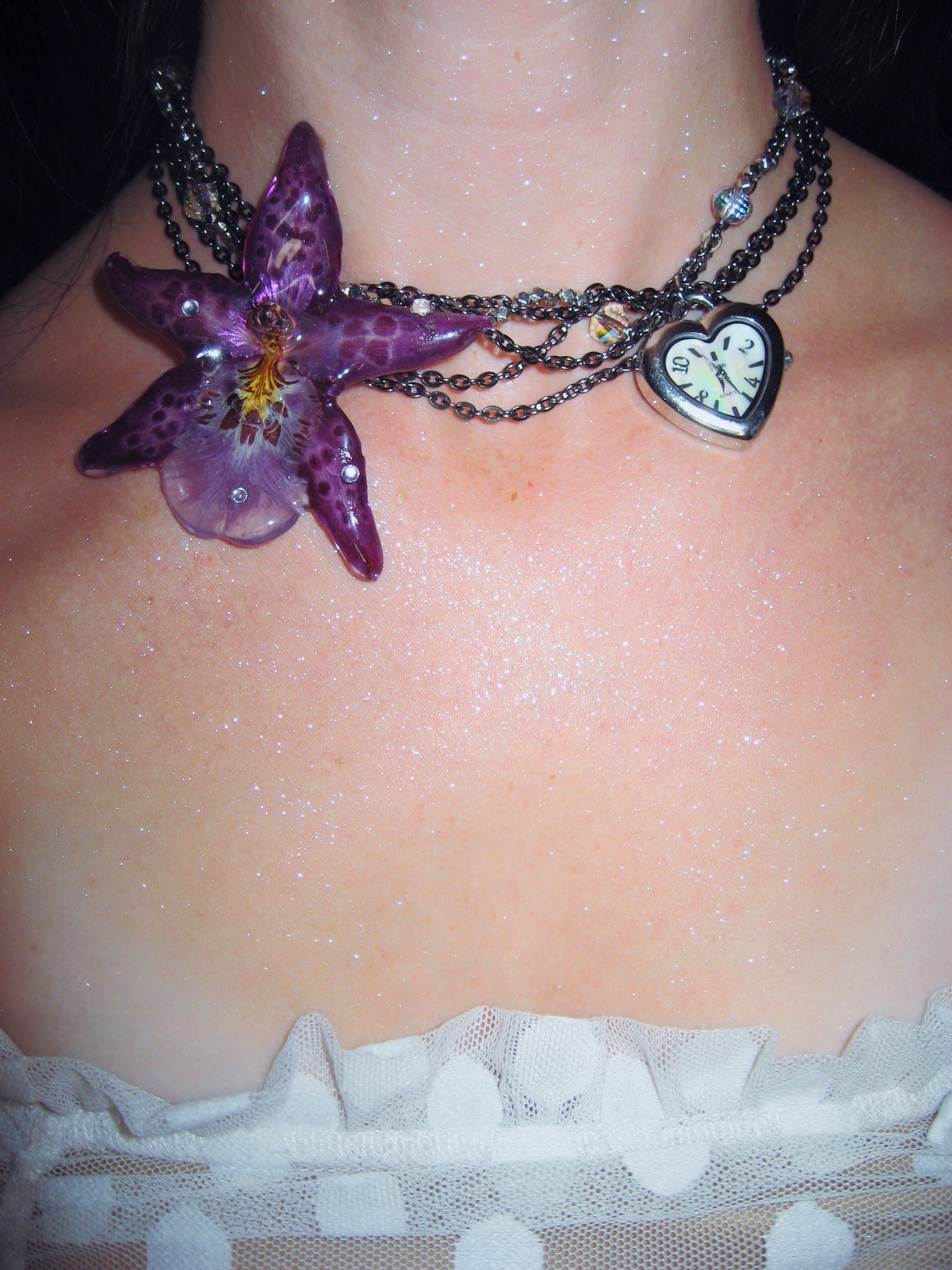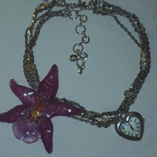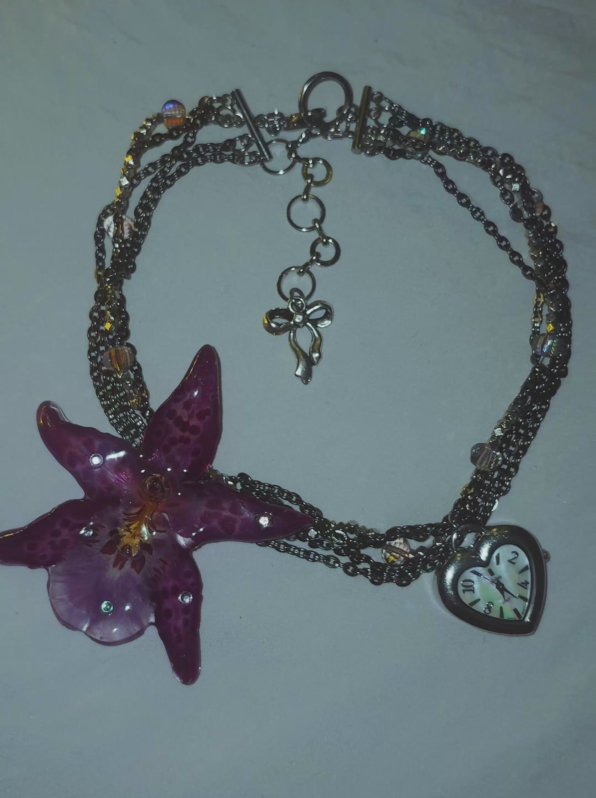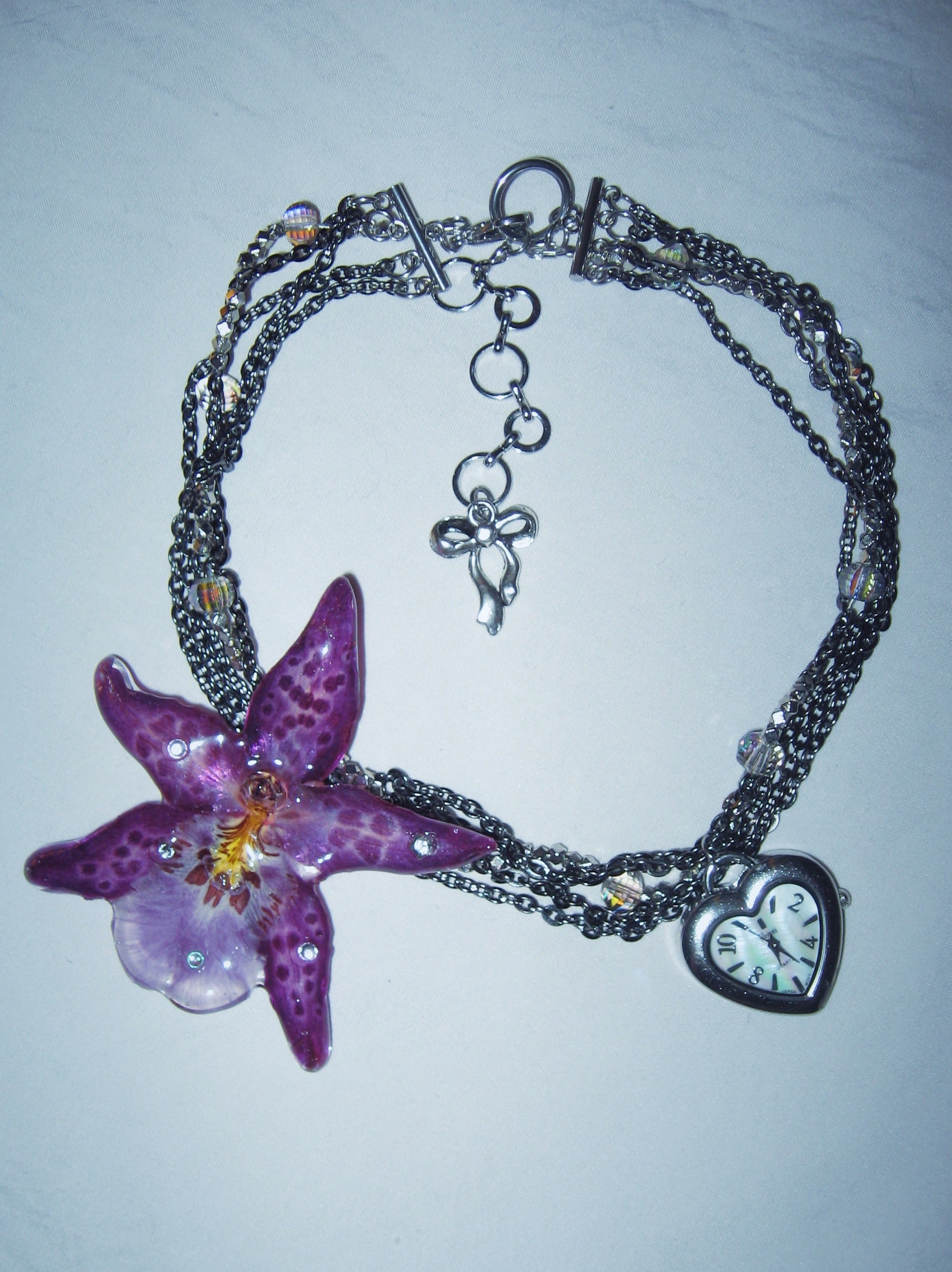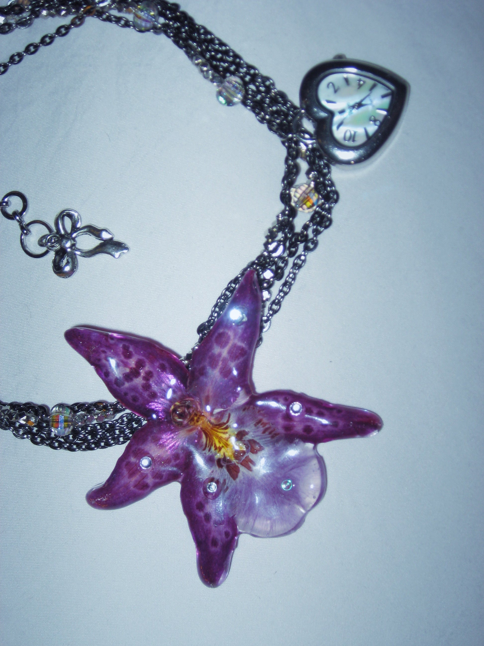 real orchid flower surrounded by assorted glass beads, gunmetal stainless steel chain and a vintage watch face (without battery).
