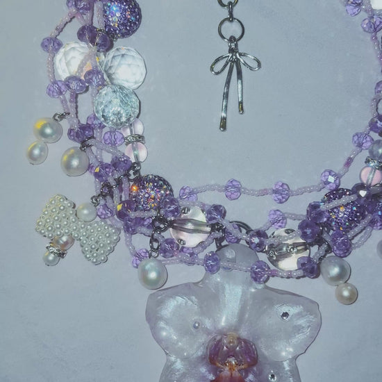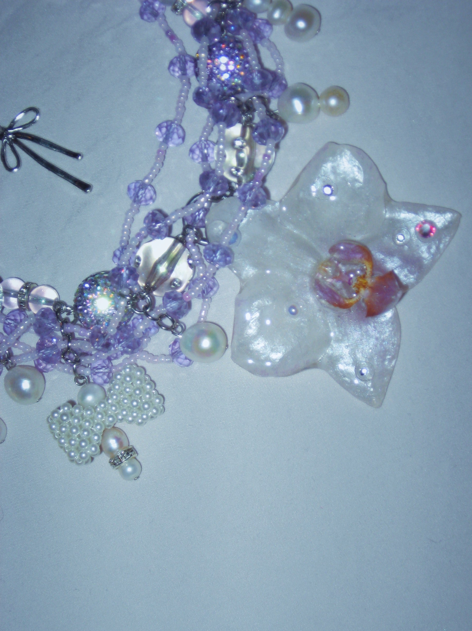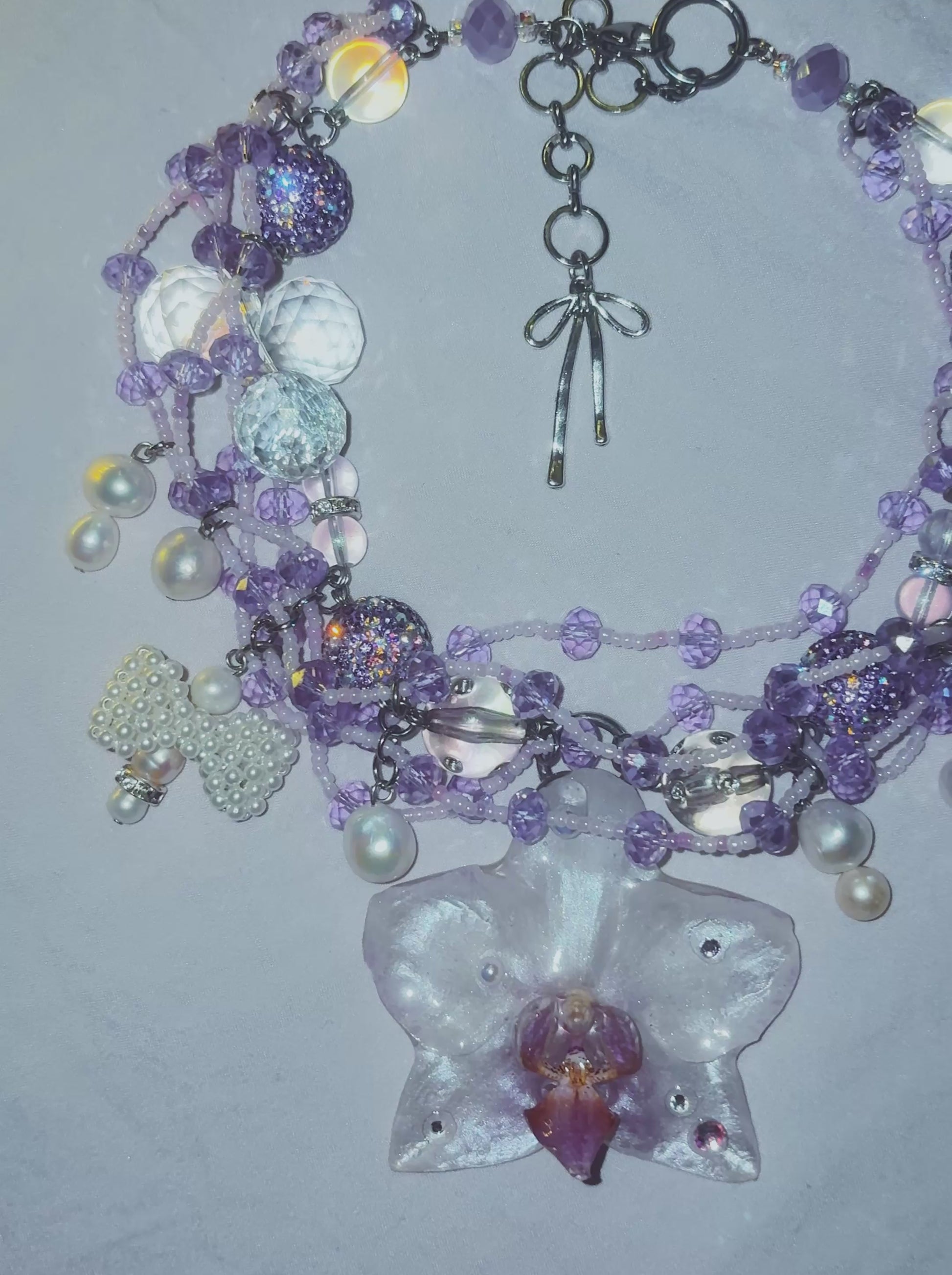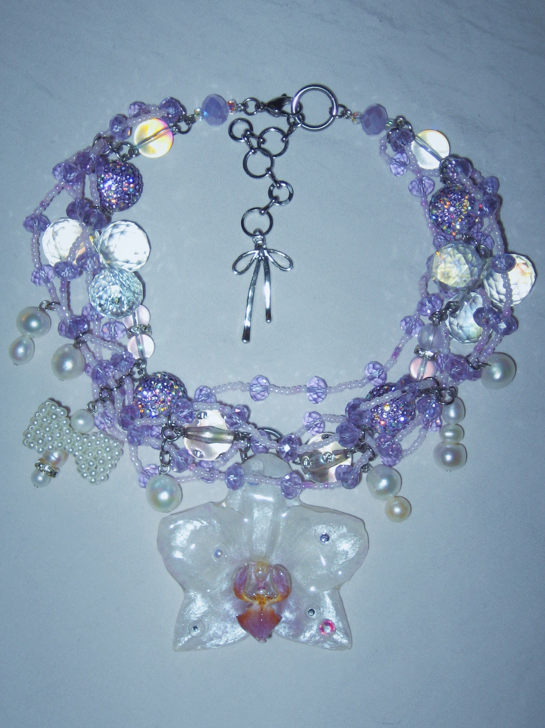 real orchid flower surrounded by assorted glass, freshwater pearls and acrylic beads.