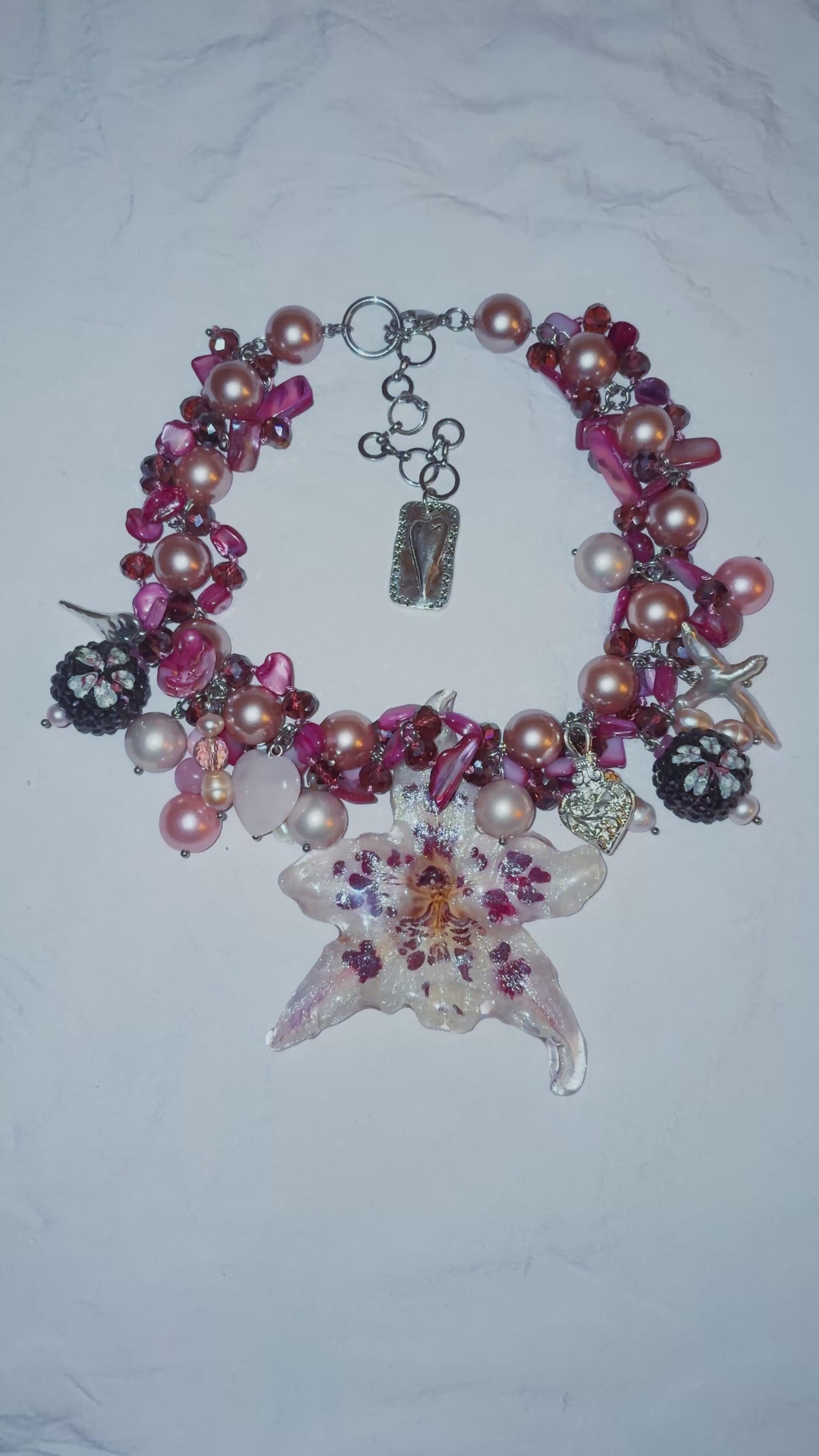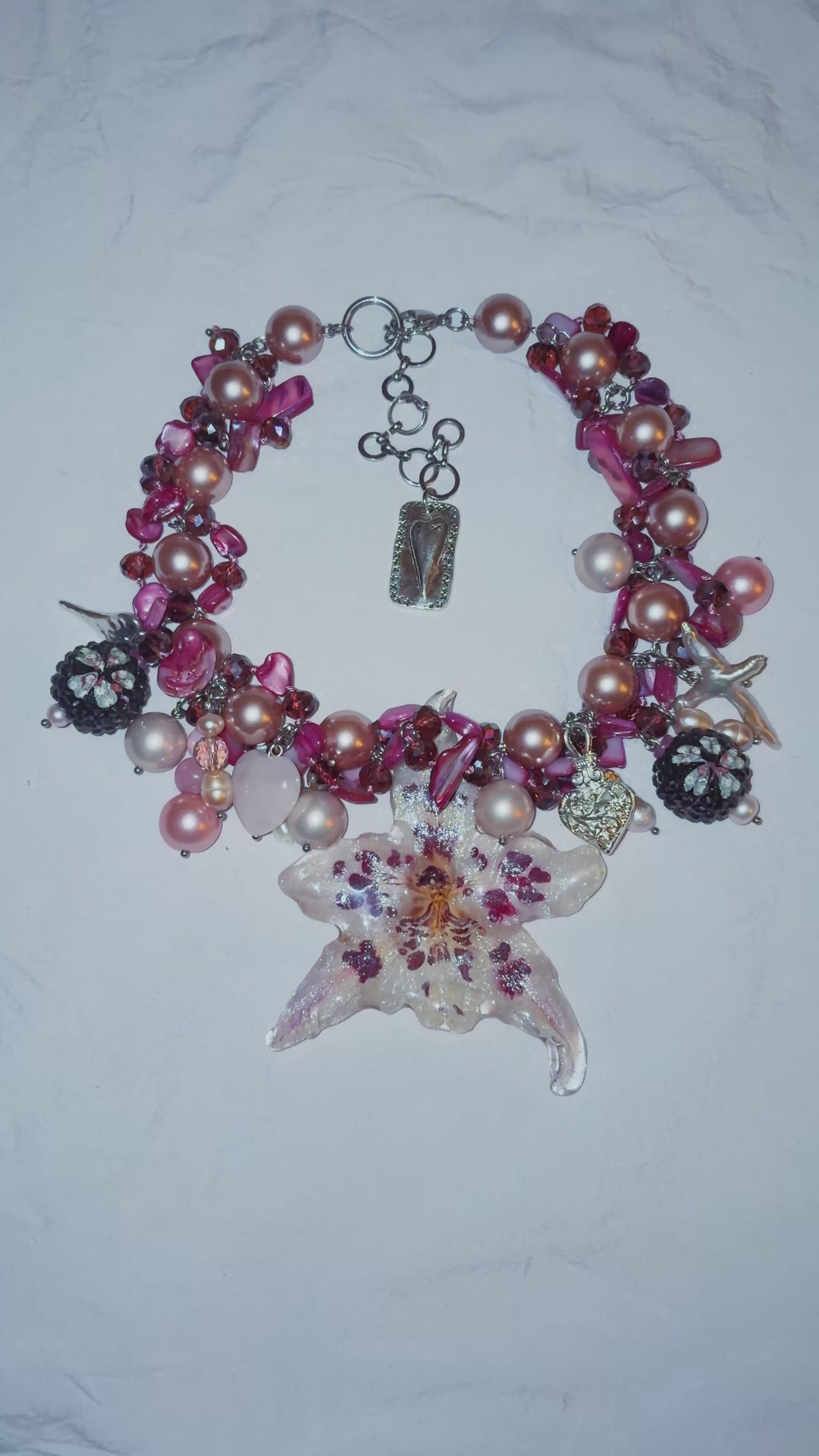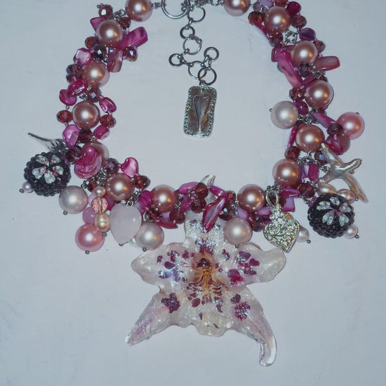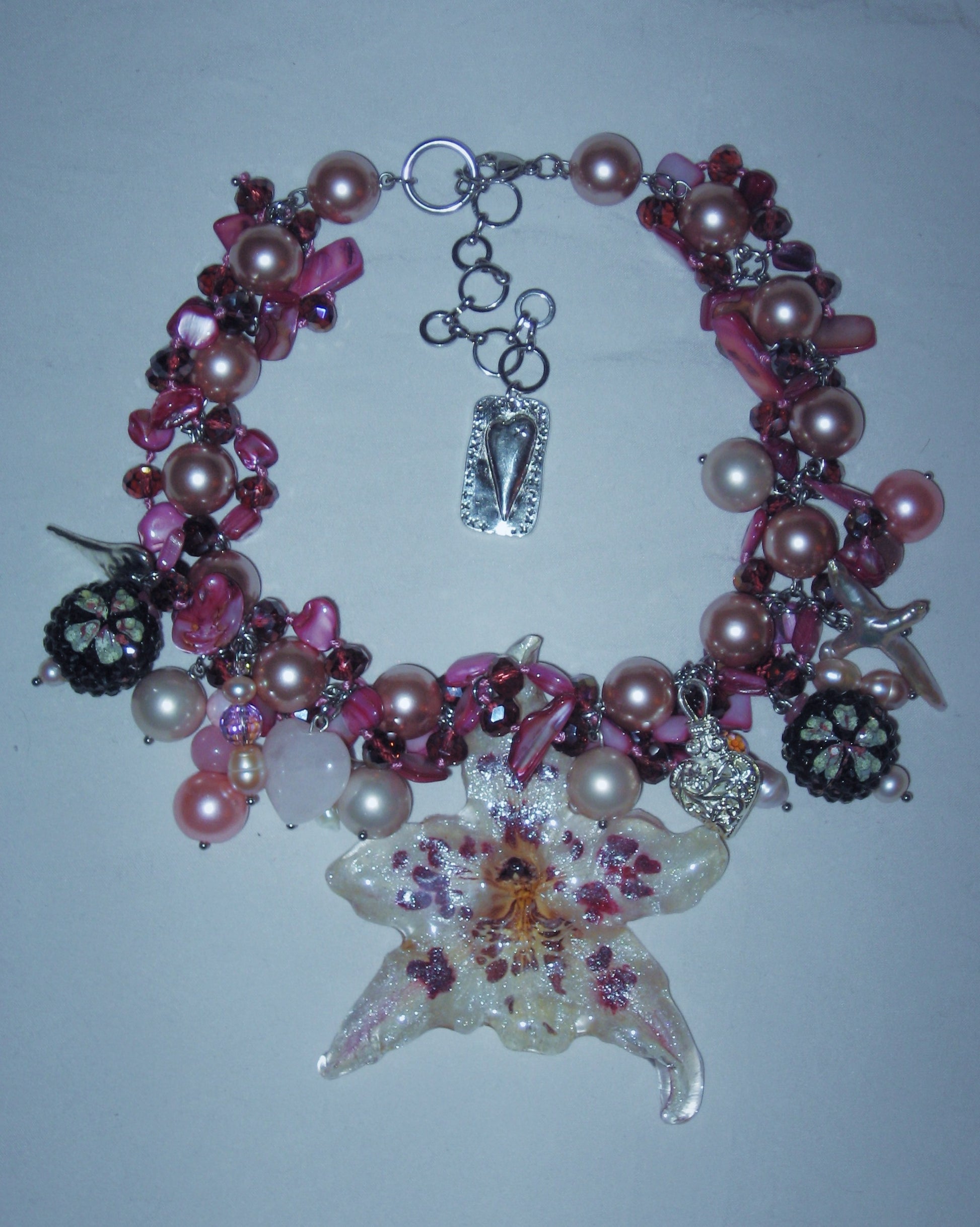 real orchid flower surrounded by assorted glass, freshwater pearls, acrylic, shell and rose quartz.