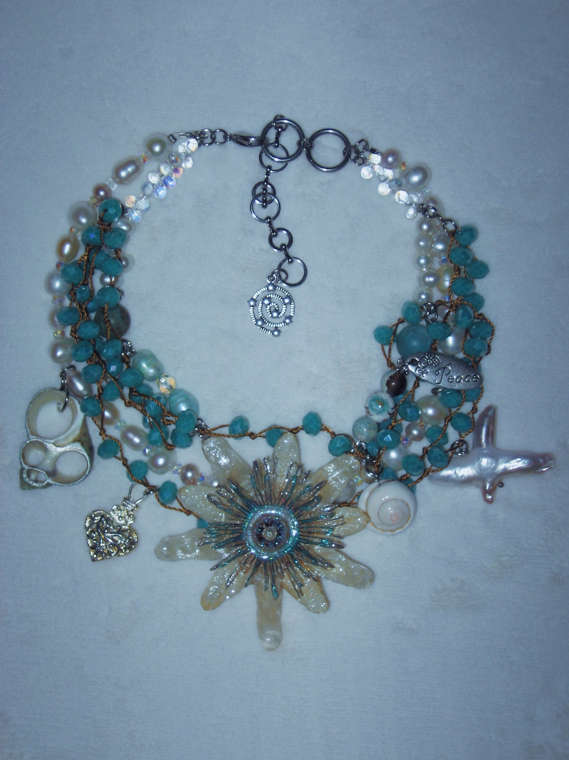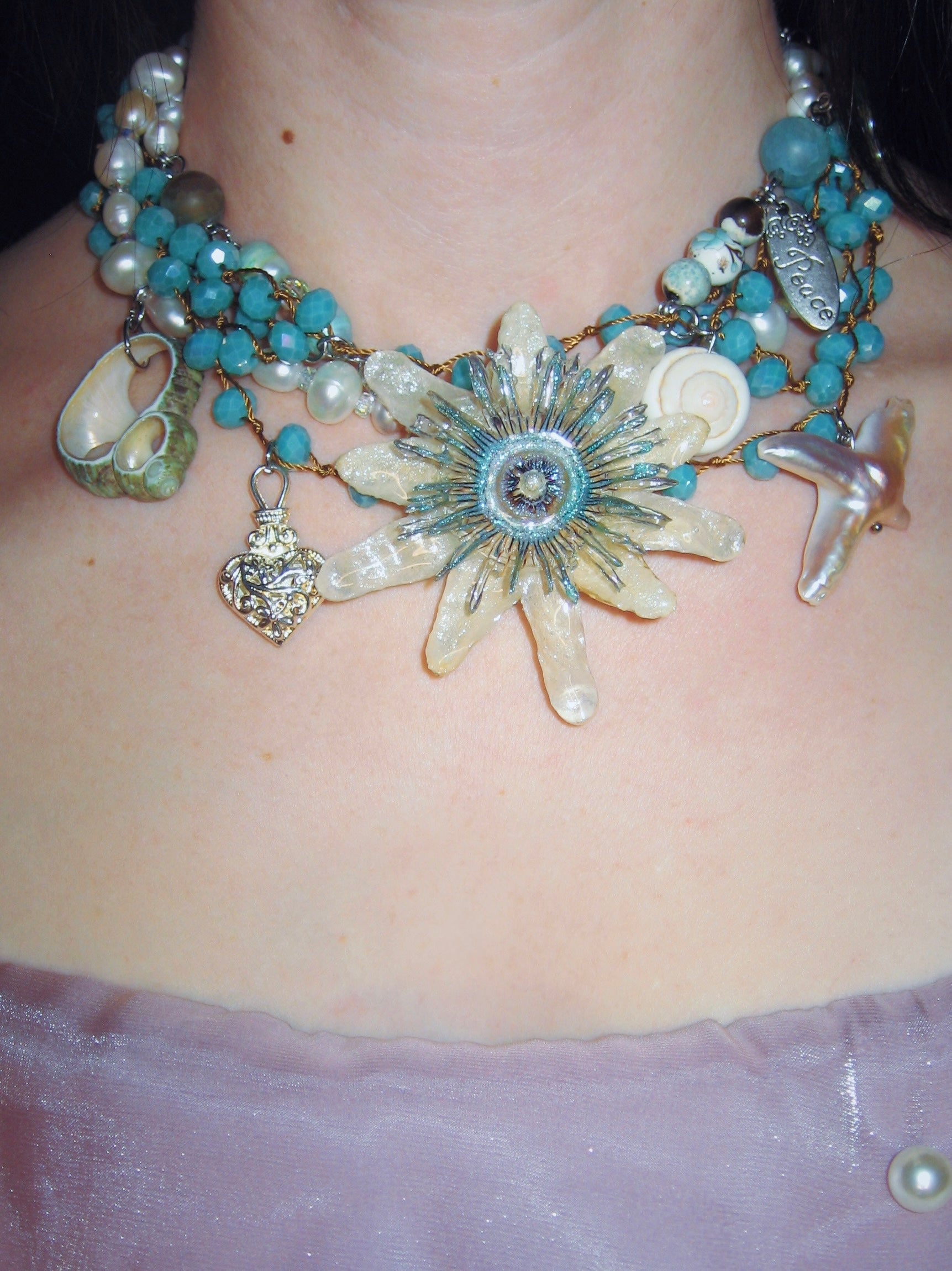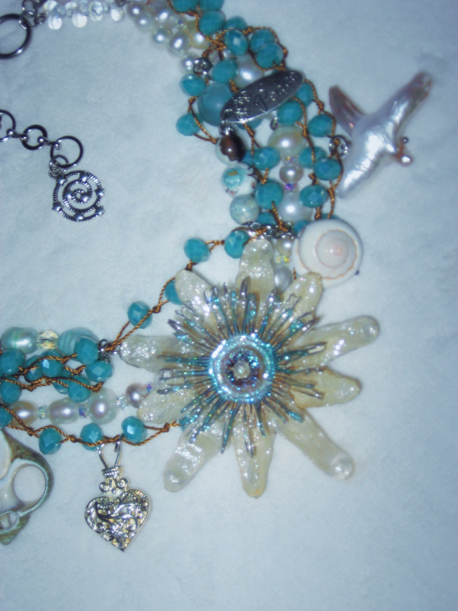 real passionflower surrounded by glass, shell, ceramic and freshwater pearls.