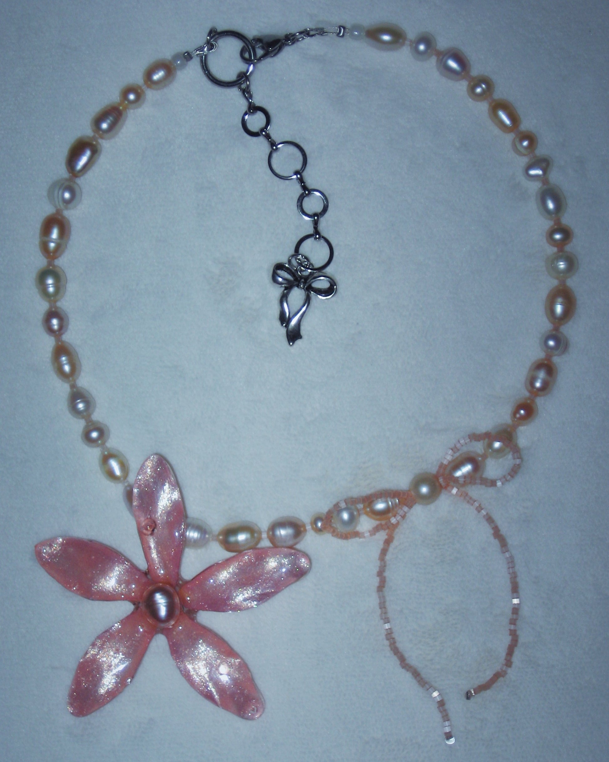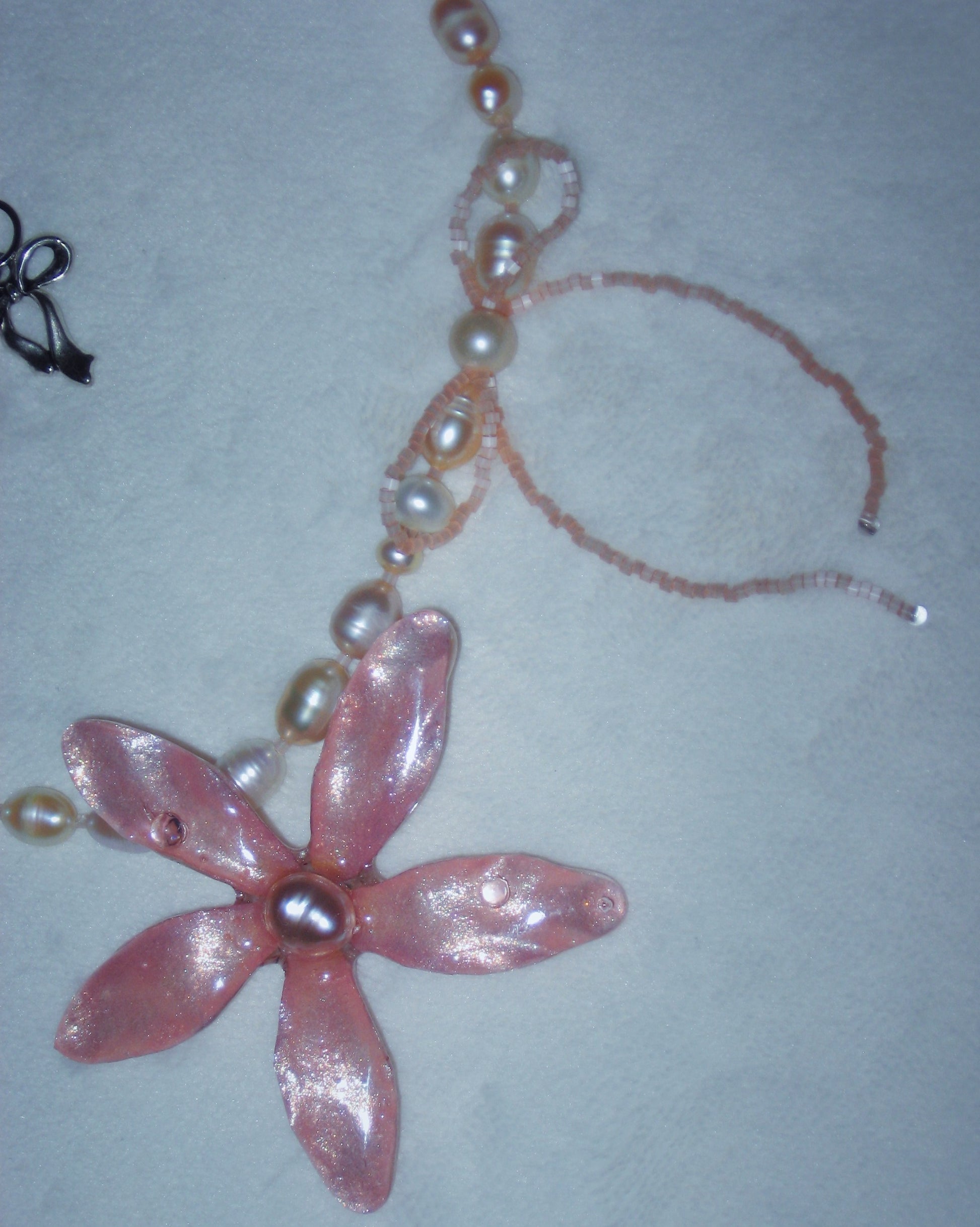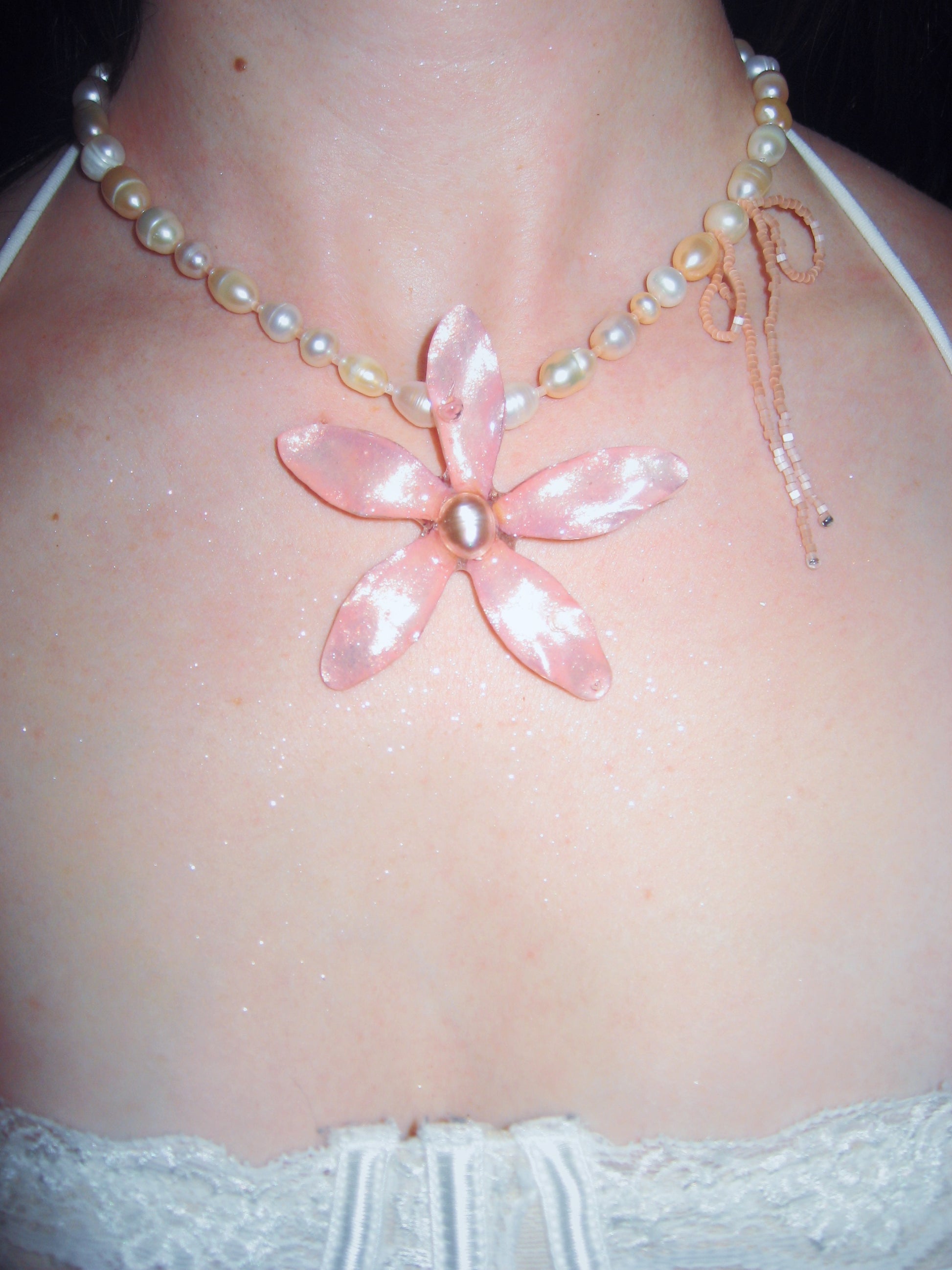 real plumeria flower surrounded by glass and freshwater pearls.