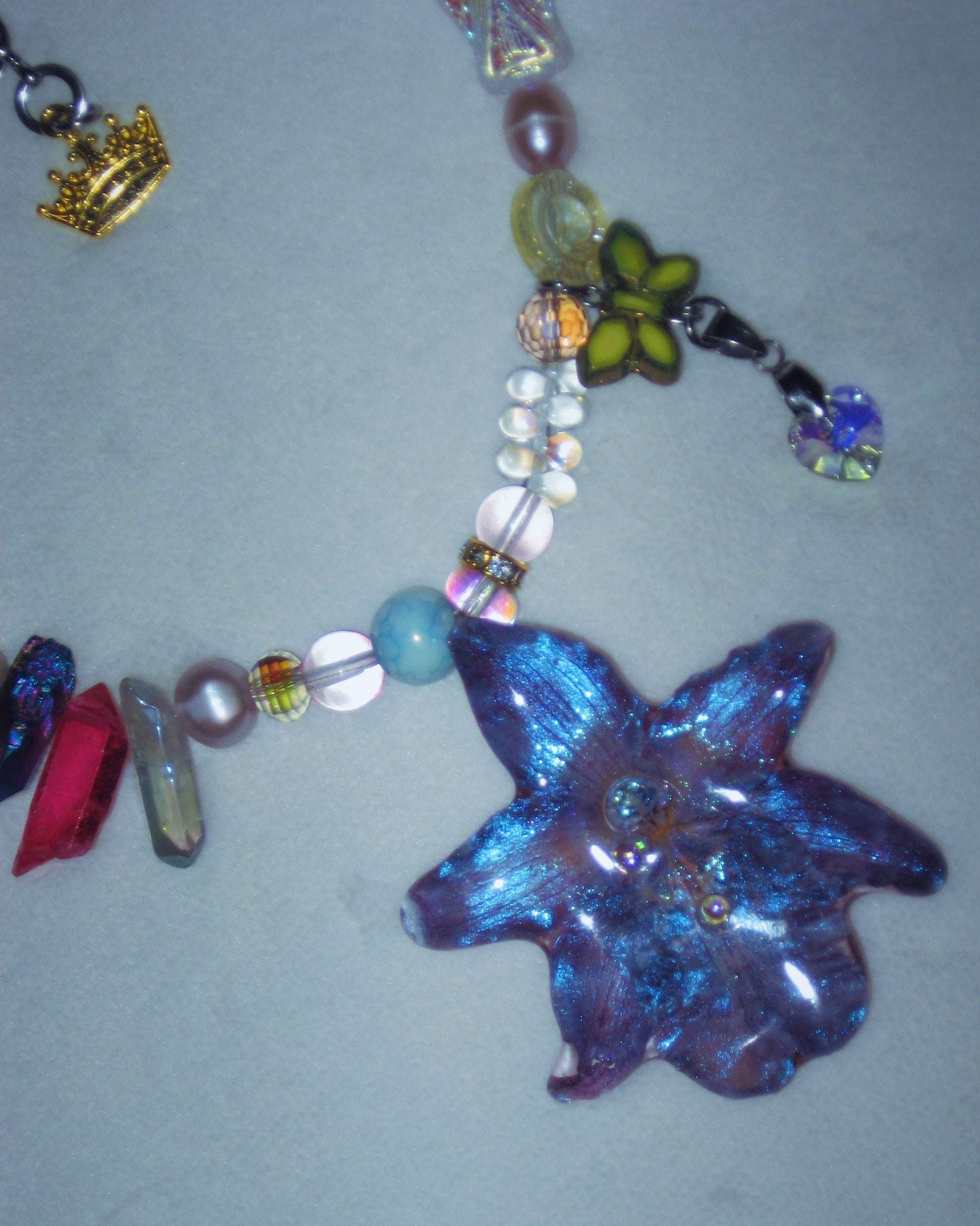 real orchid flower surrounded by glass, freshwater pearls, and quartz.