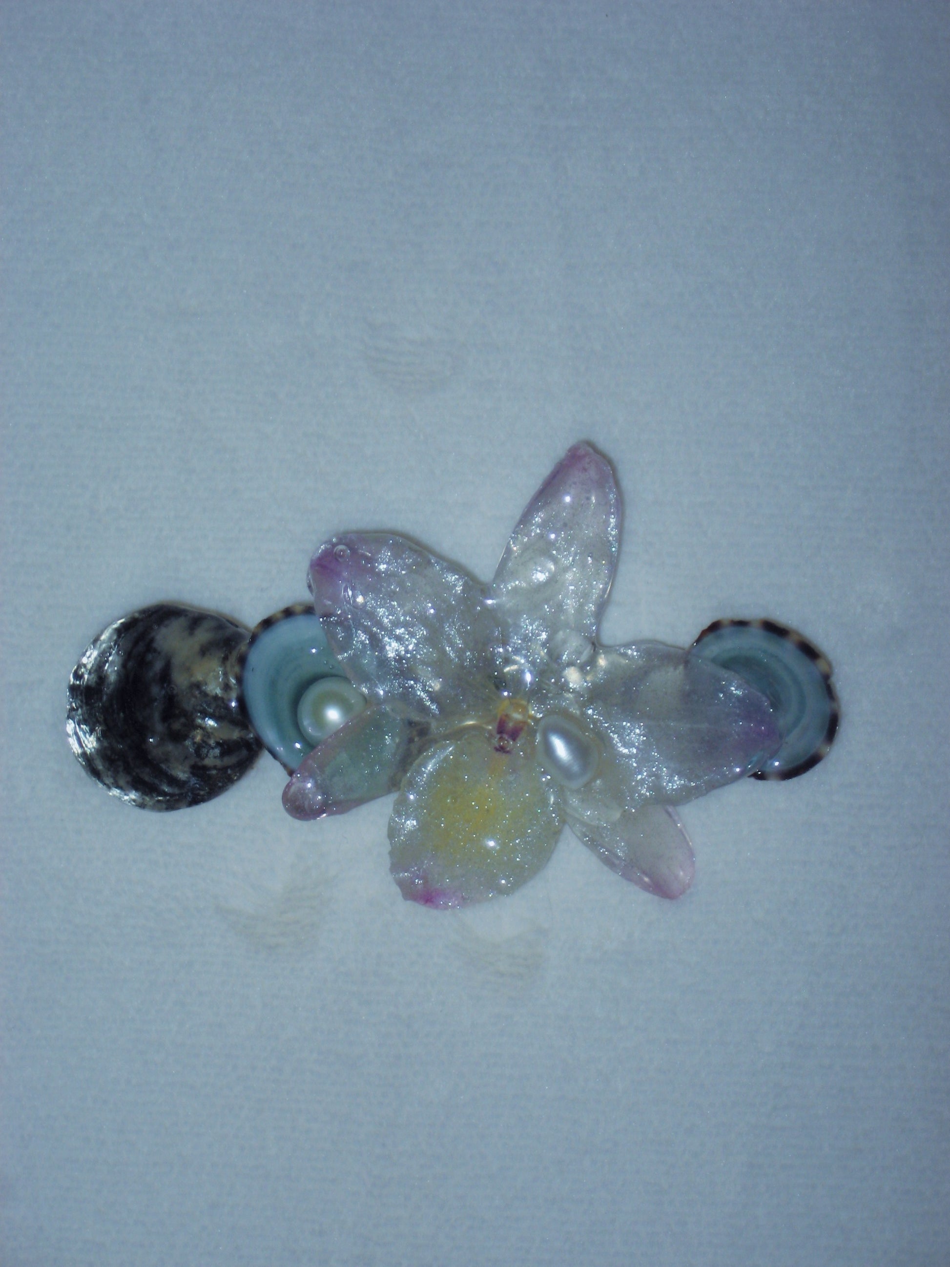 real orchid flower hair clip surrounded by assorted shells, limpet and freshwater pearls.