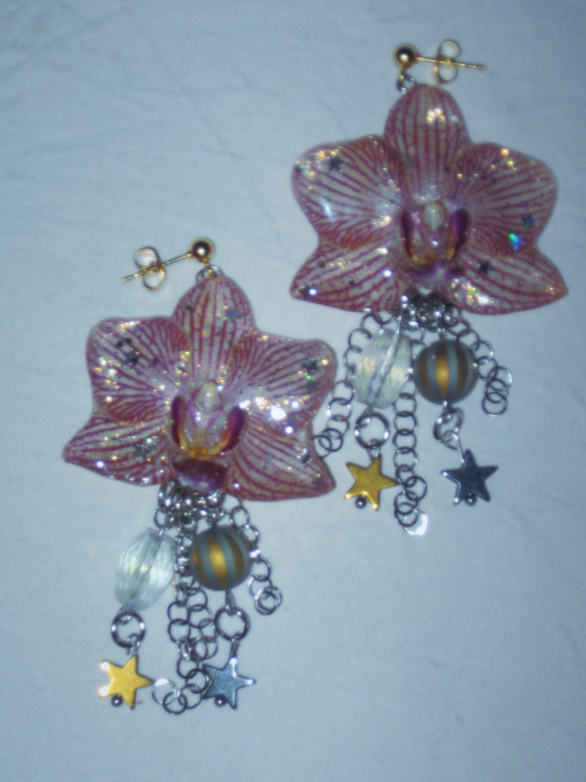 real orchid flower earrings surrounded by glass and hematite. all stainless steel hardware.