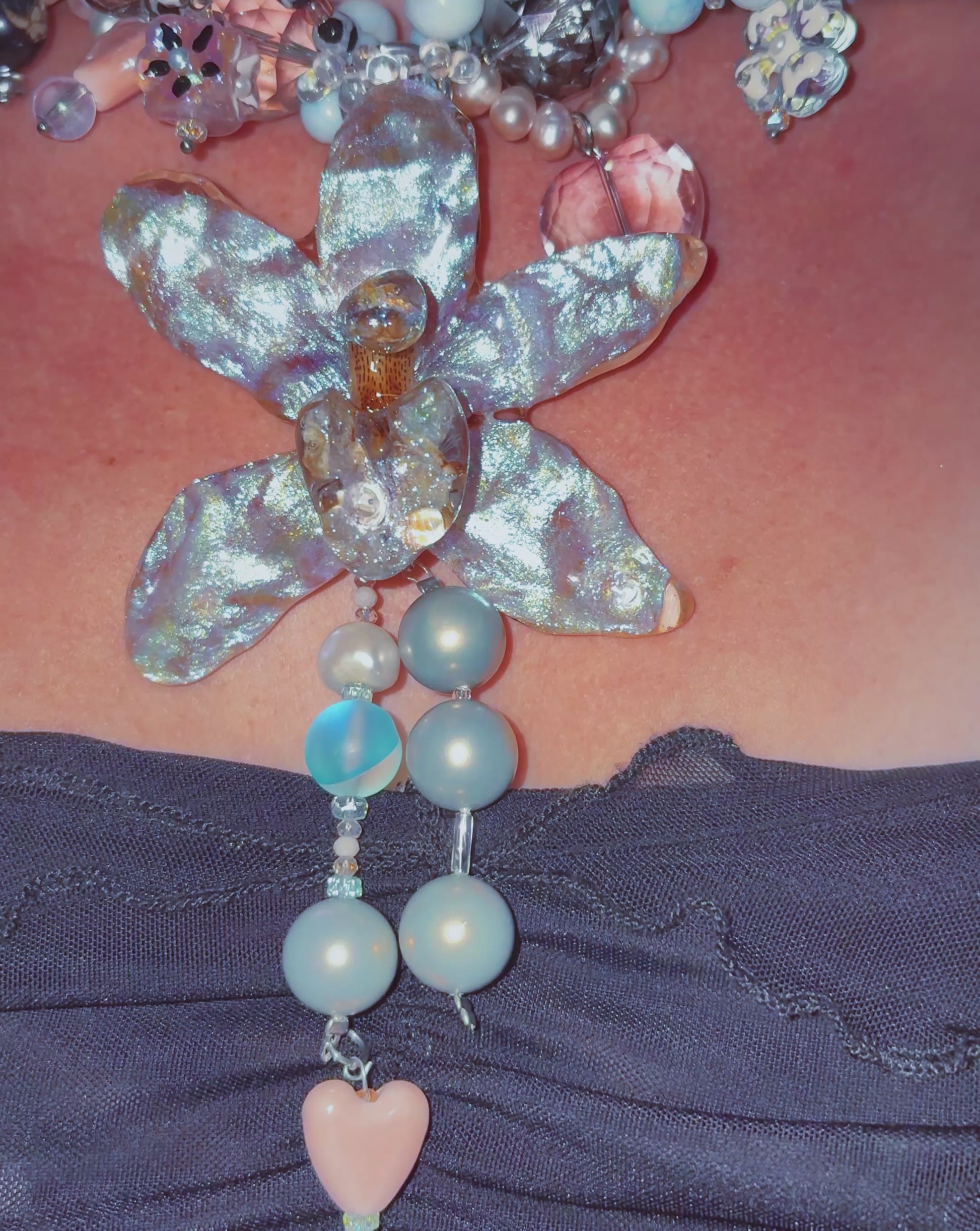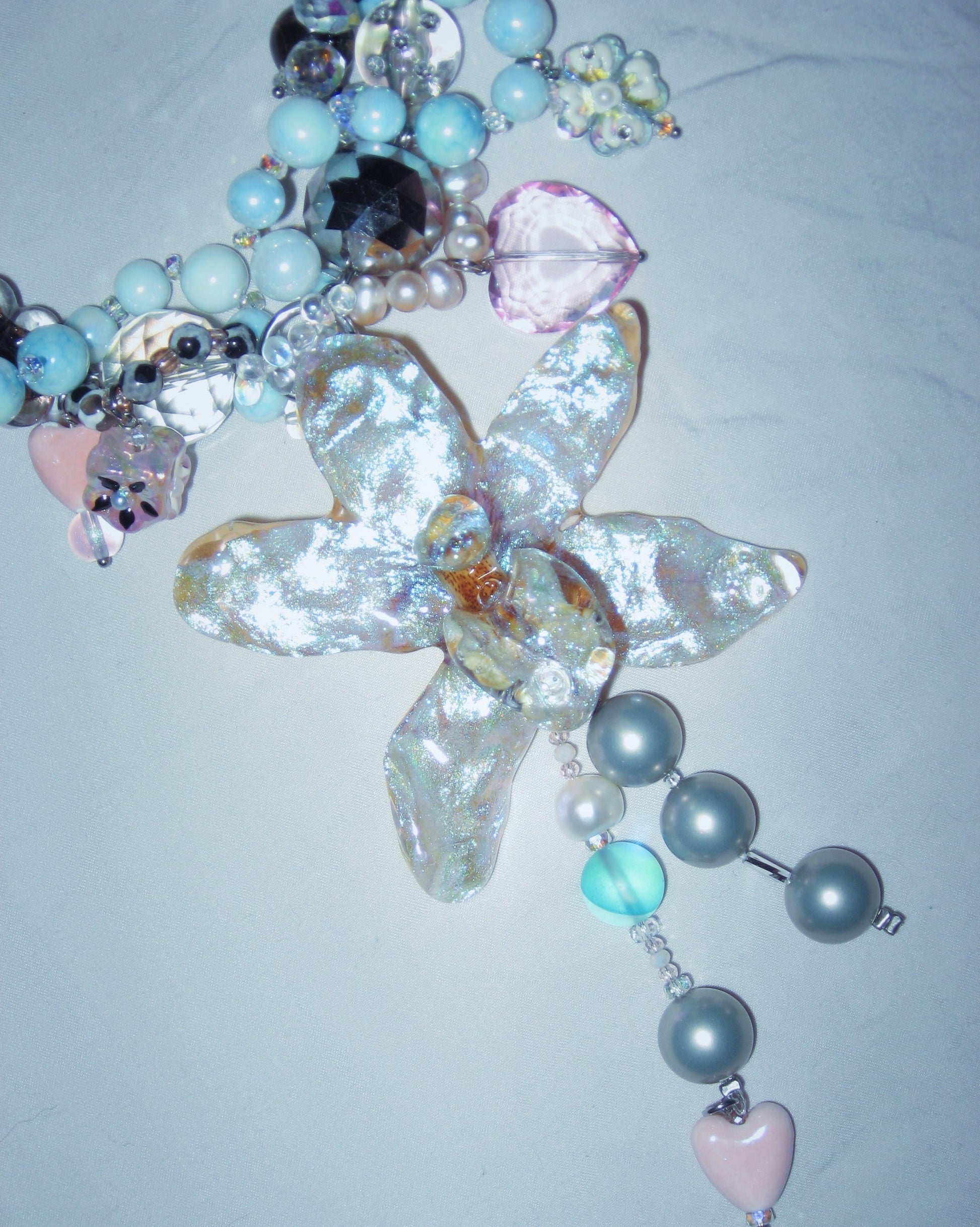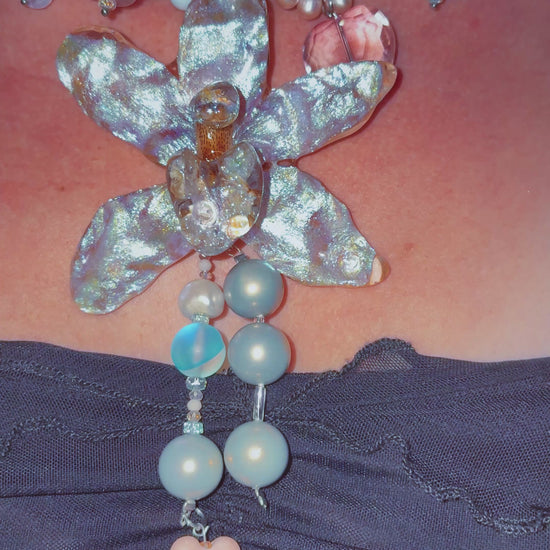 real orchid surrounded by assorted glass, ceramic, freshwater pearls, hand-painted acrylic, mother of pearl and quartz.
