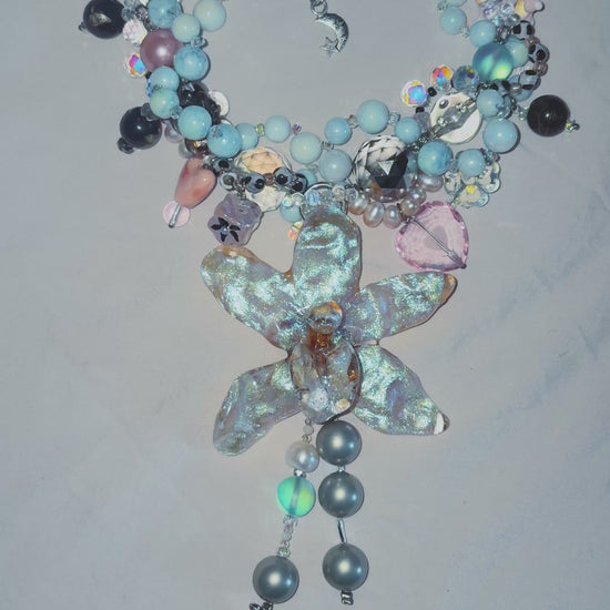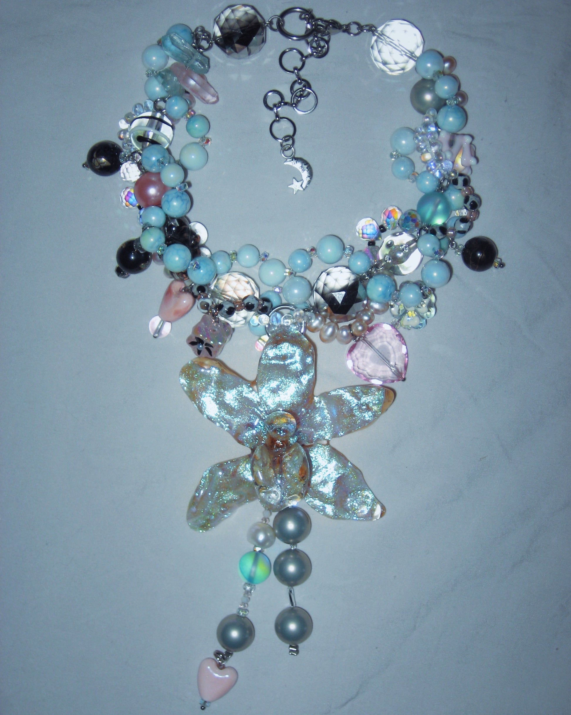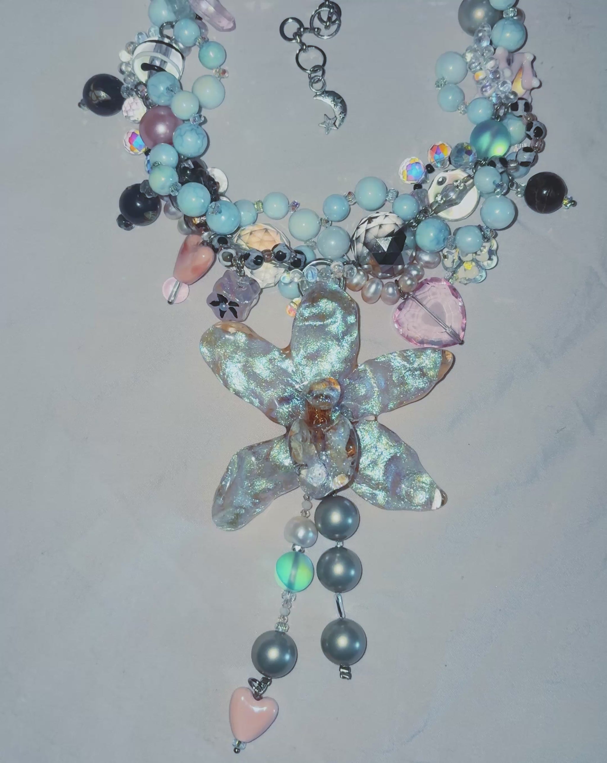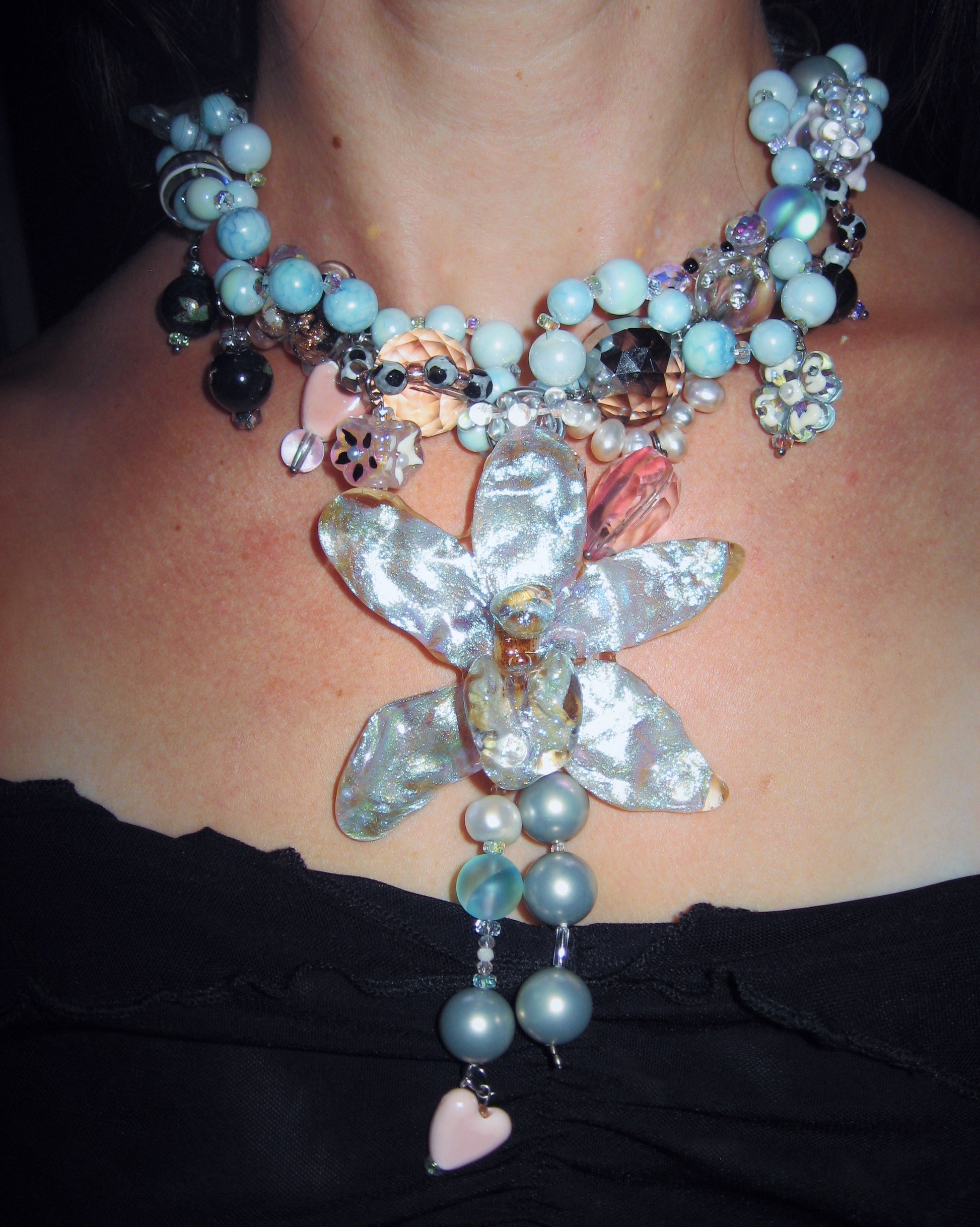 real orchid surrounded by assorted glass, ceramic, freshwater pearls, hand-painted acrylic, mother of pearl and quartz.