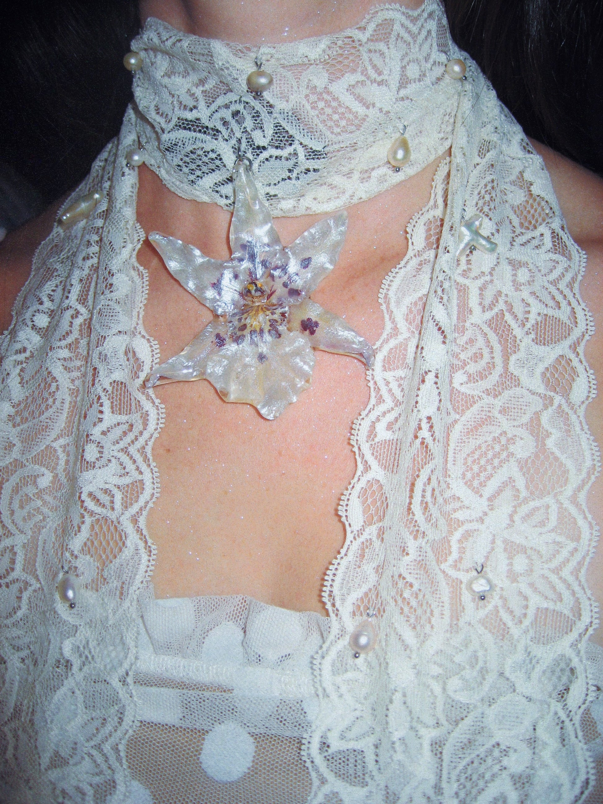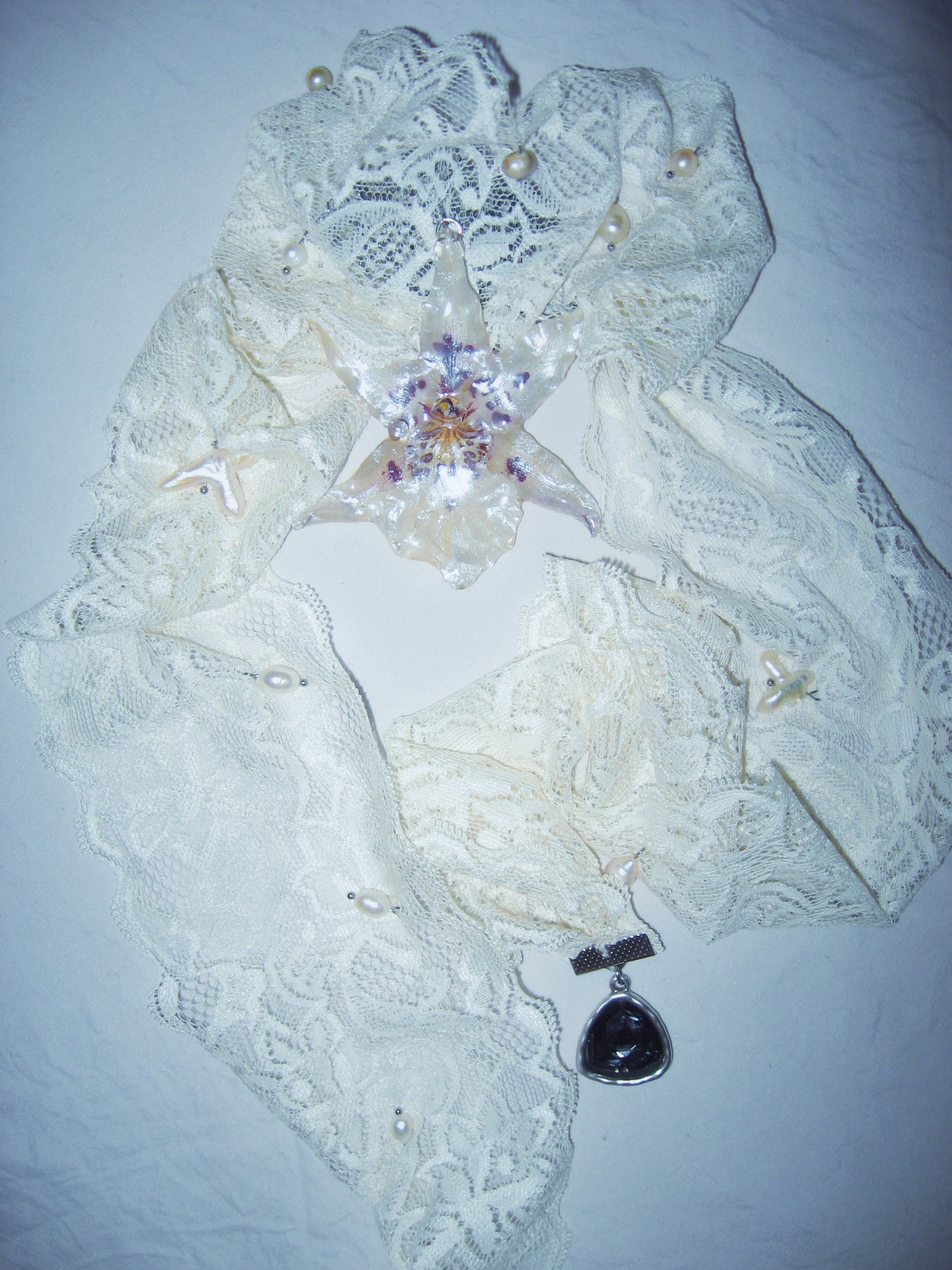 real orchid flower surrounded by the softest lace and freshwater pearls. meant to be worn like a scarf.