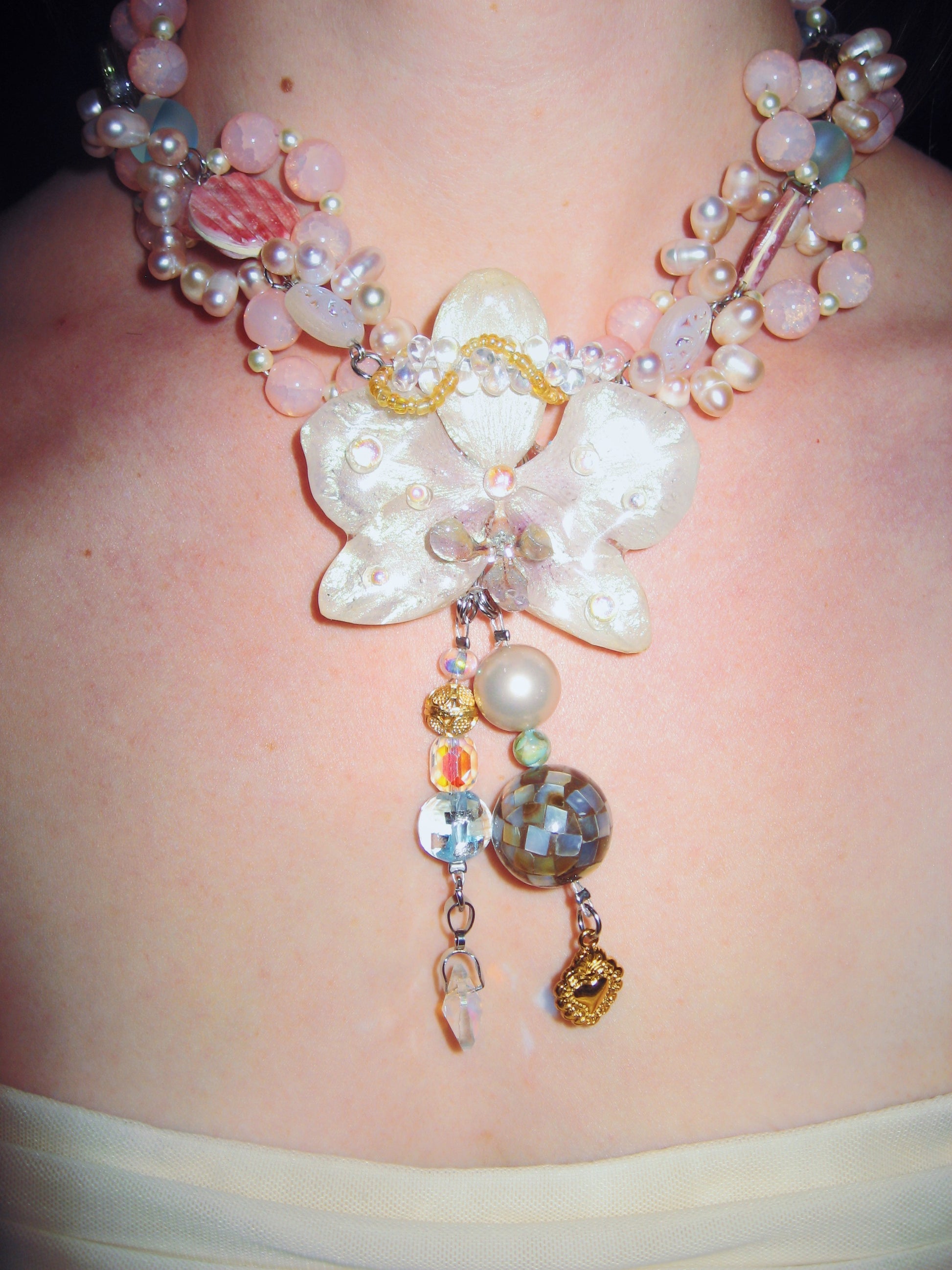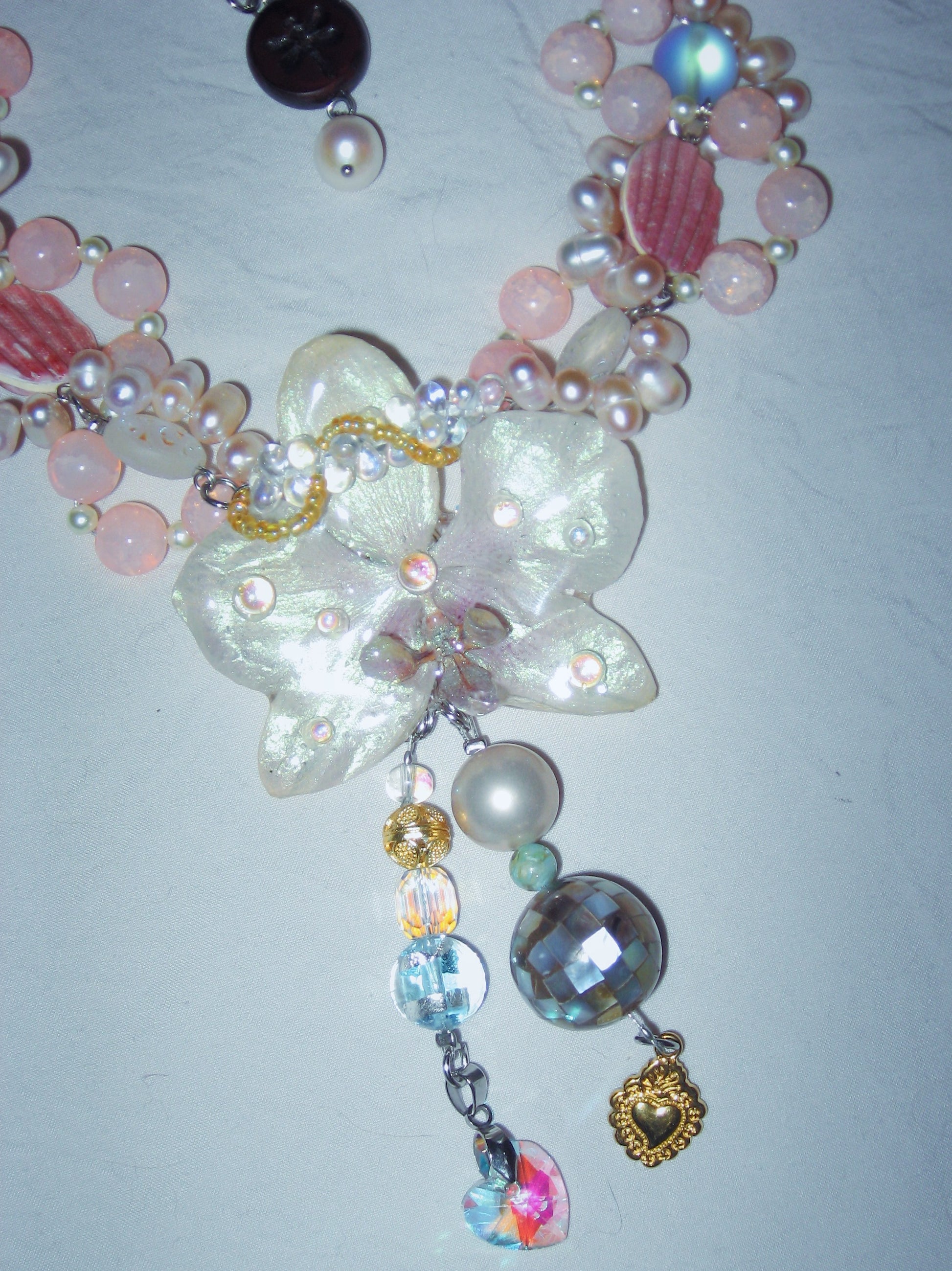 real orchid flower surrounded by glass, freshwater pearls, abalone, shell.