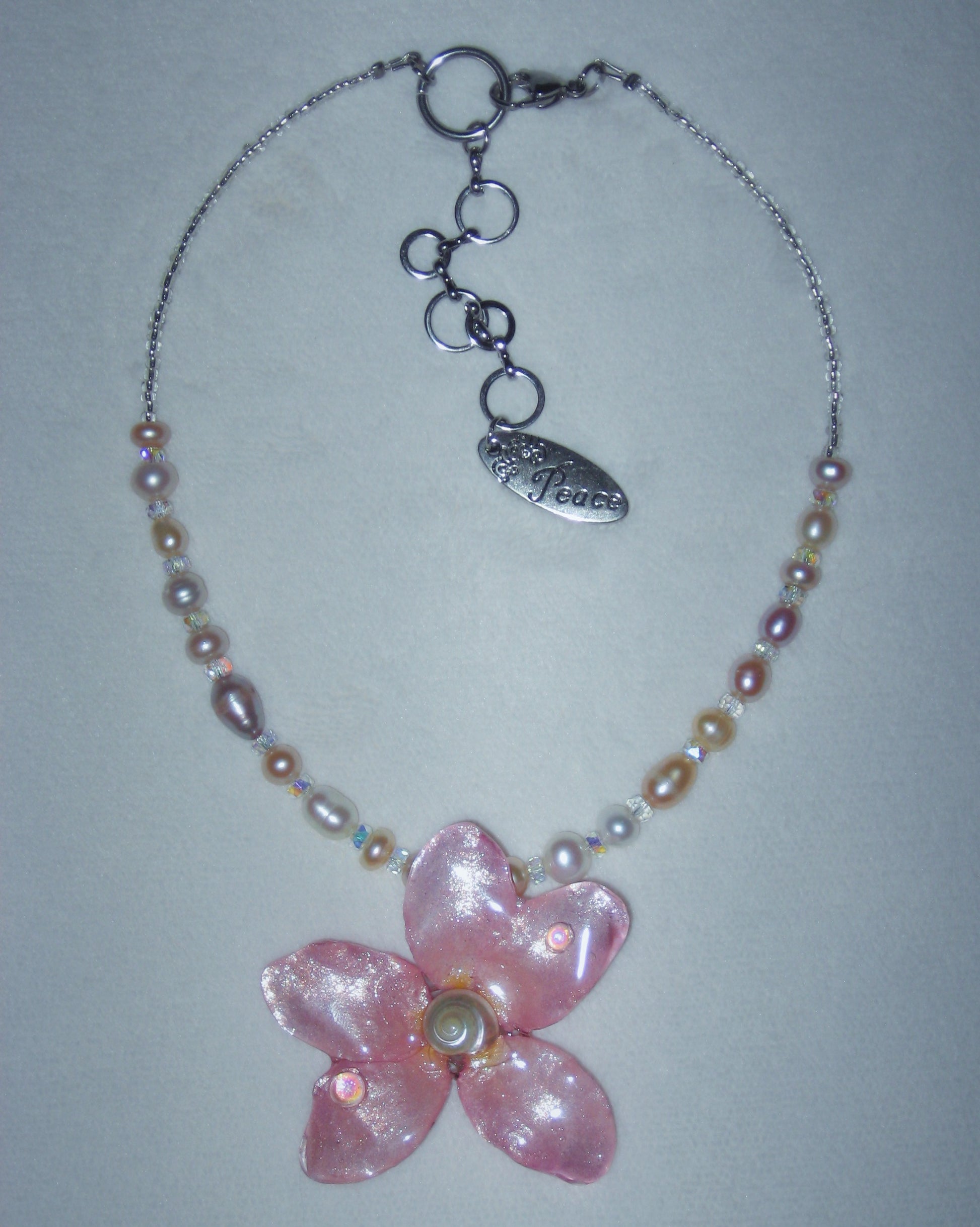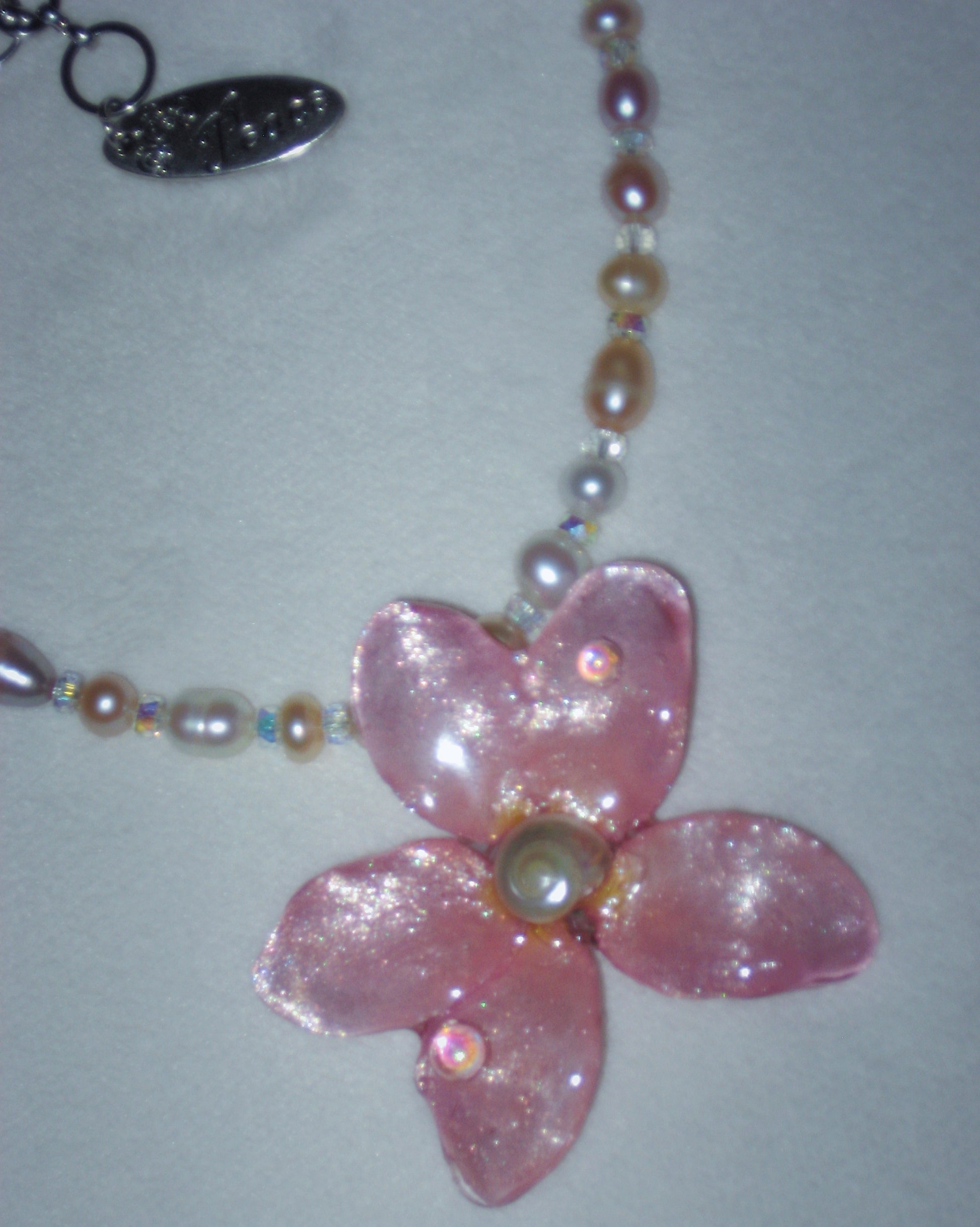 real plumeria flower surrounded by glass, freshwater pearls, and shell