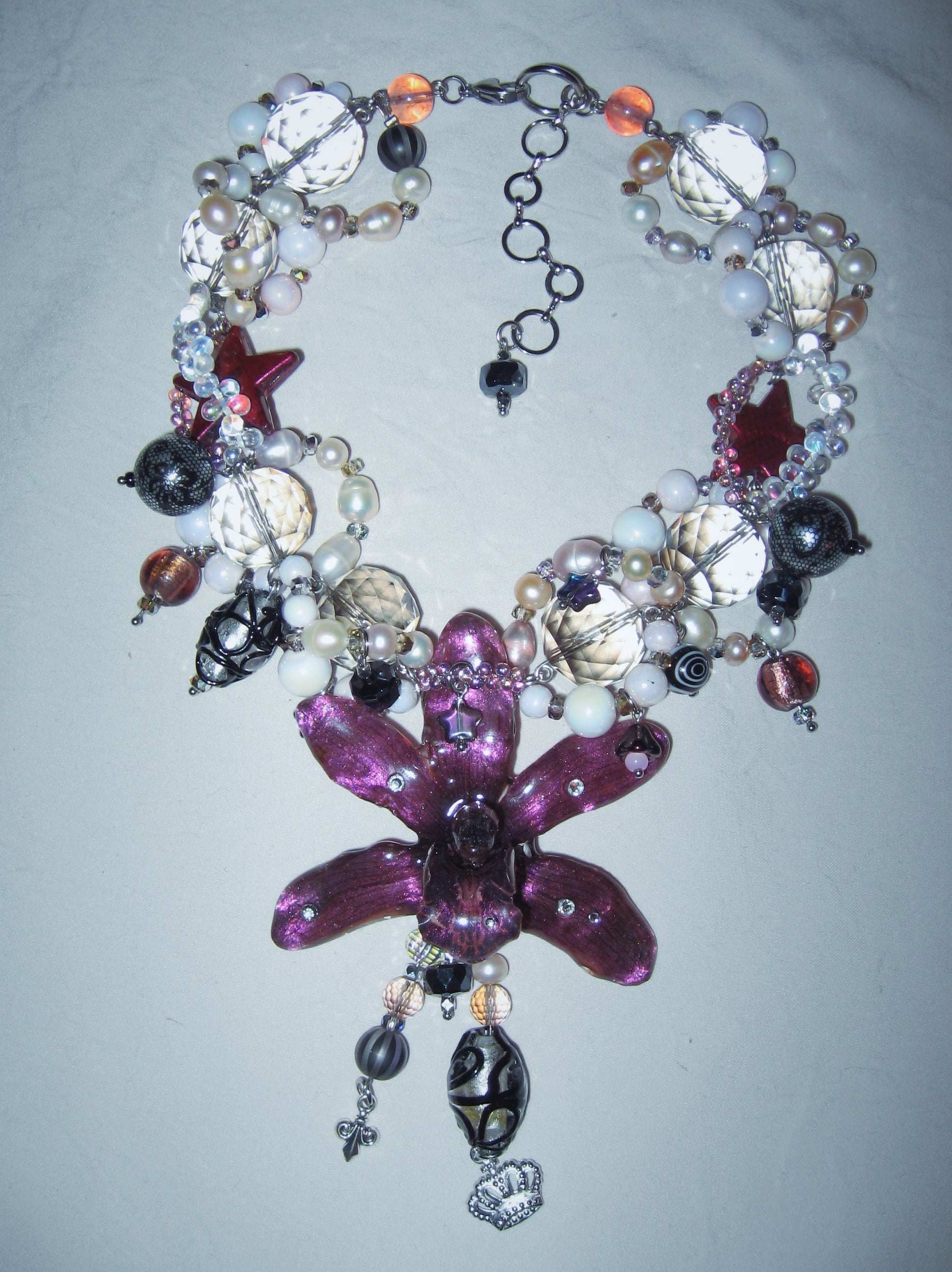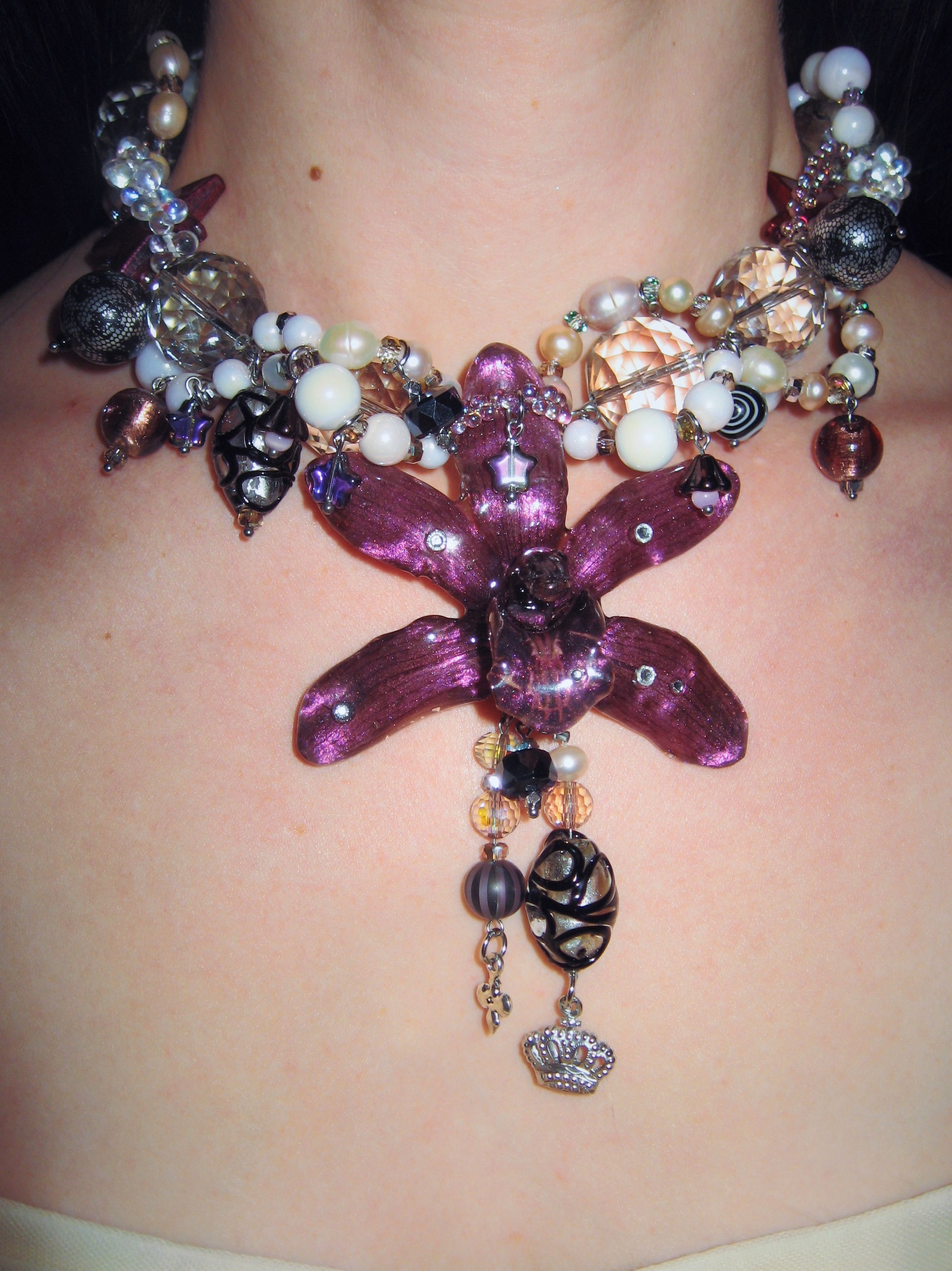 real orchid flower surrounded by glass, freshwater pearls, and acrylic.
