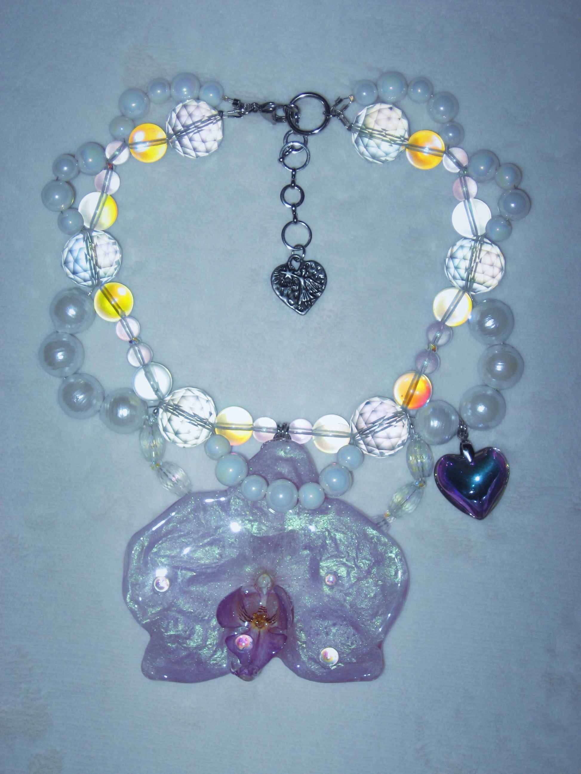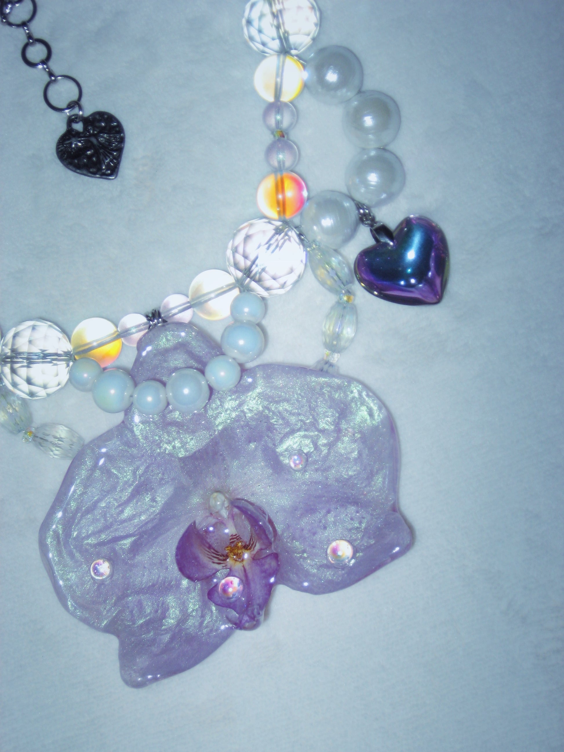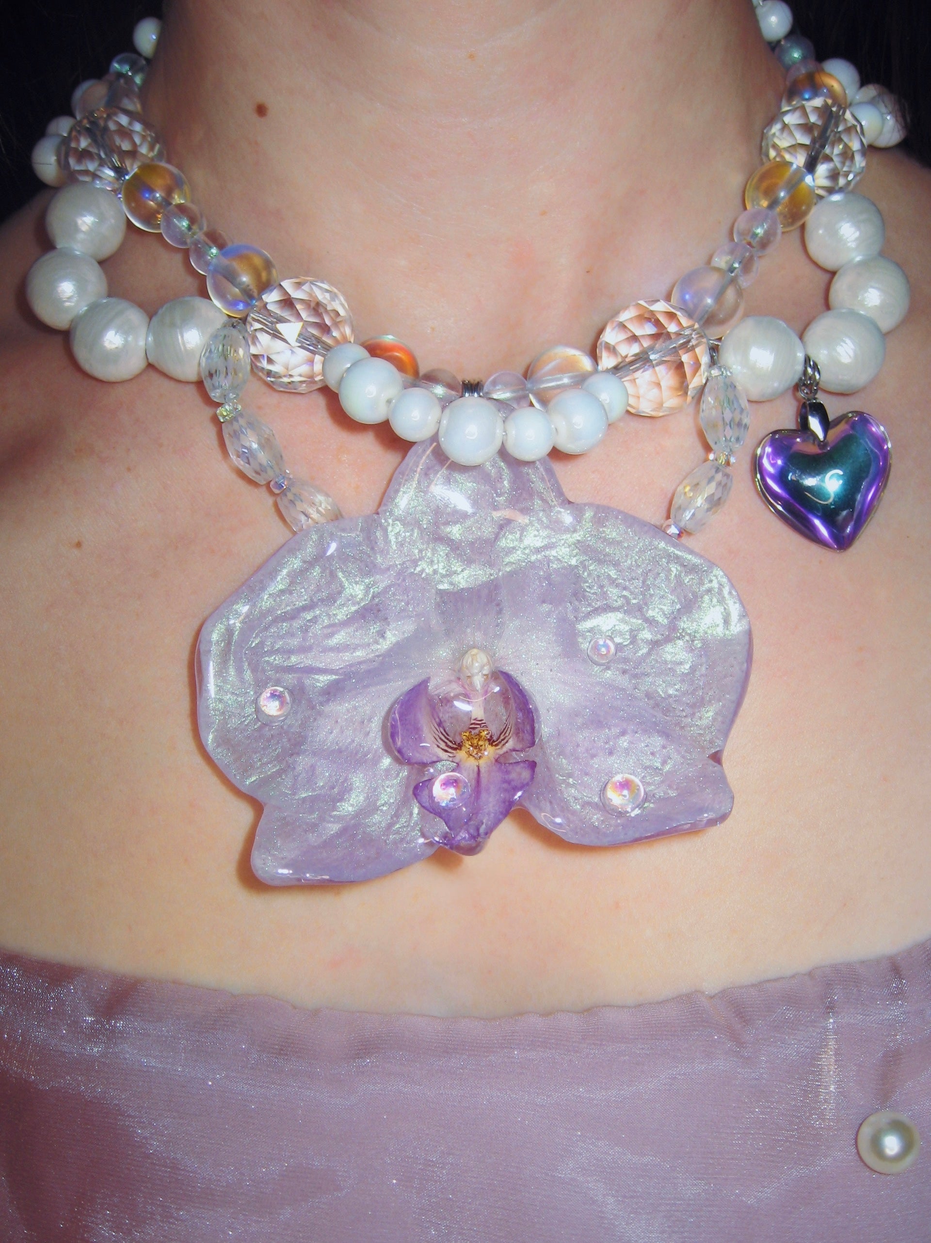 real orchid flower surrounded by assorted glass and mother of pearl.